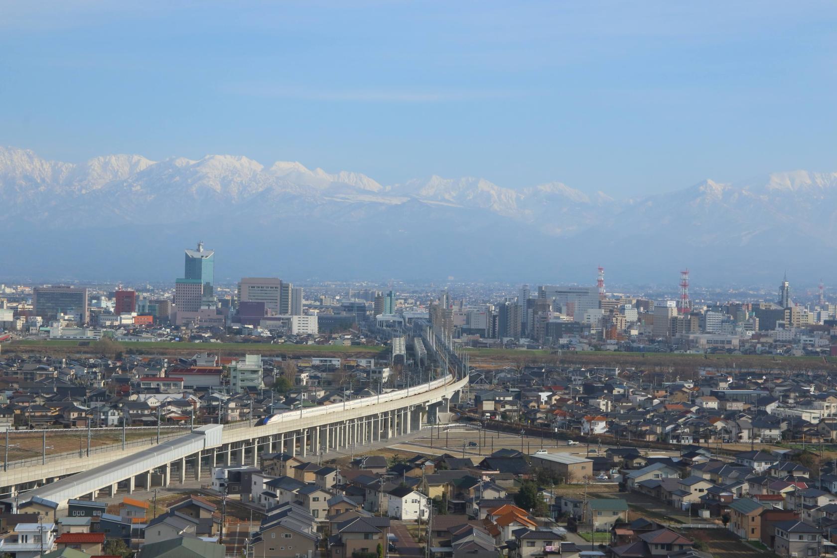 富山市街地を見下ろし、富山市民の憩いの場にもなっている呉羽山展望台。立山連峰を背景に富山市中心部のビル群と神通川を渡ってくる北陸新幹線を撮影することができます。