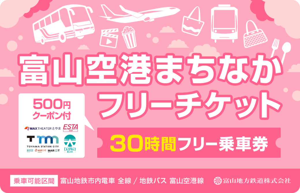 富山市内の周遊や宿泊にぴったりな富山地鉄市内電車全線と地鉄バス富山空港線が30時間乗り放題のチケットです。