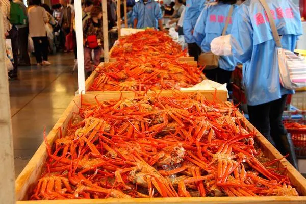 国内で唯一、湾のなかに紅ズワイガニの漁場を持ち、水揚げ量は日本随一。鮮度抜群のカニがずらりと店頭に並びます。