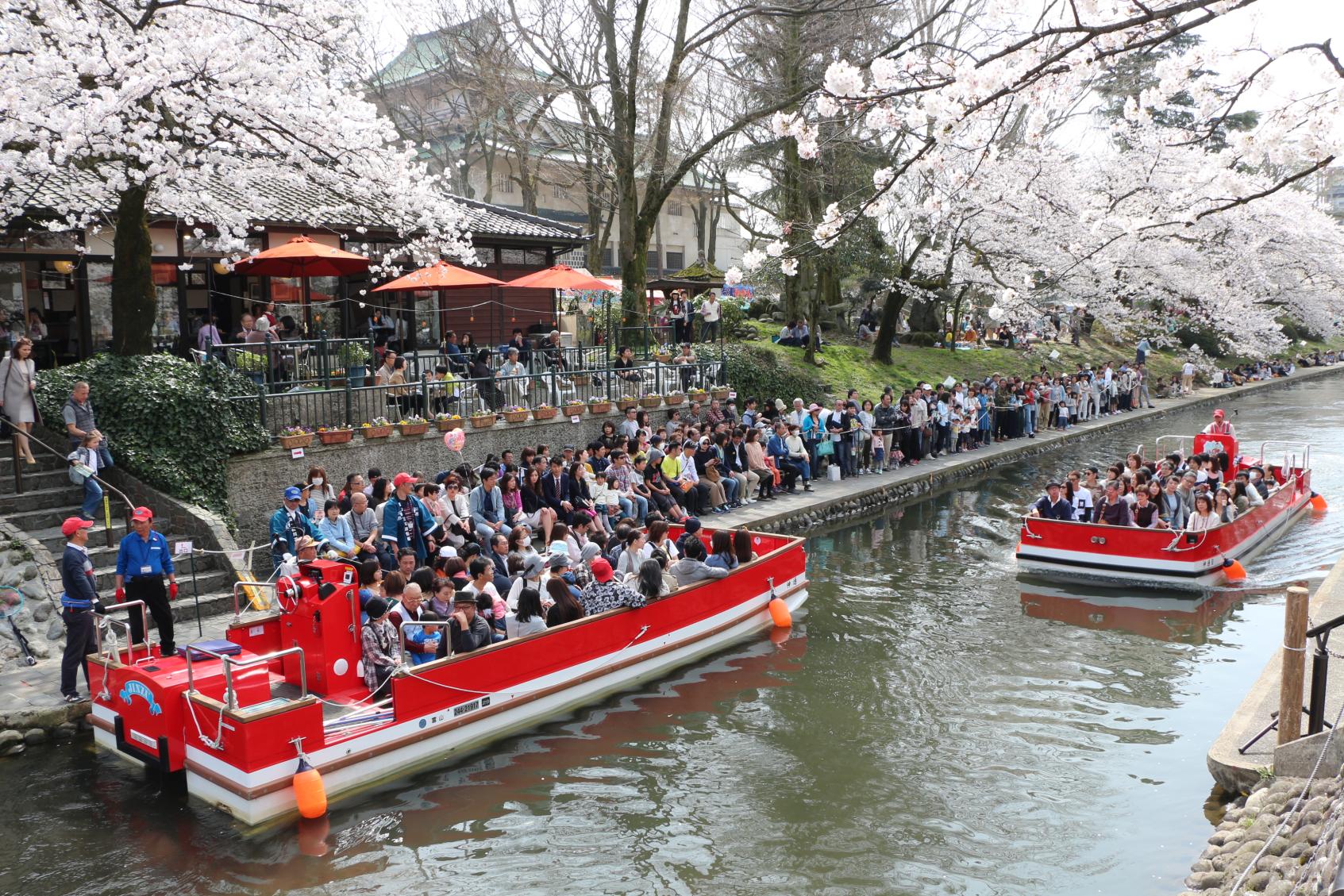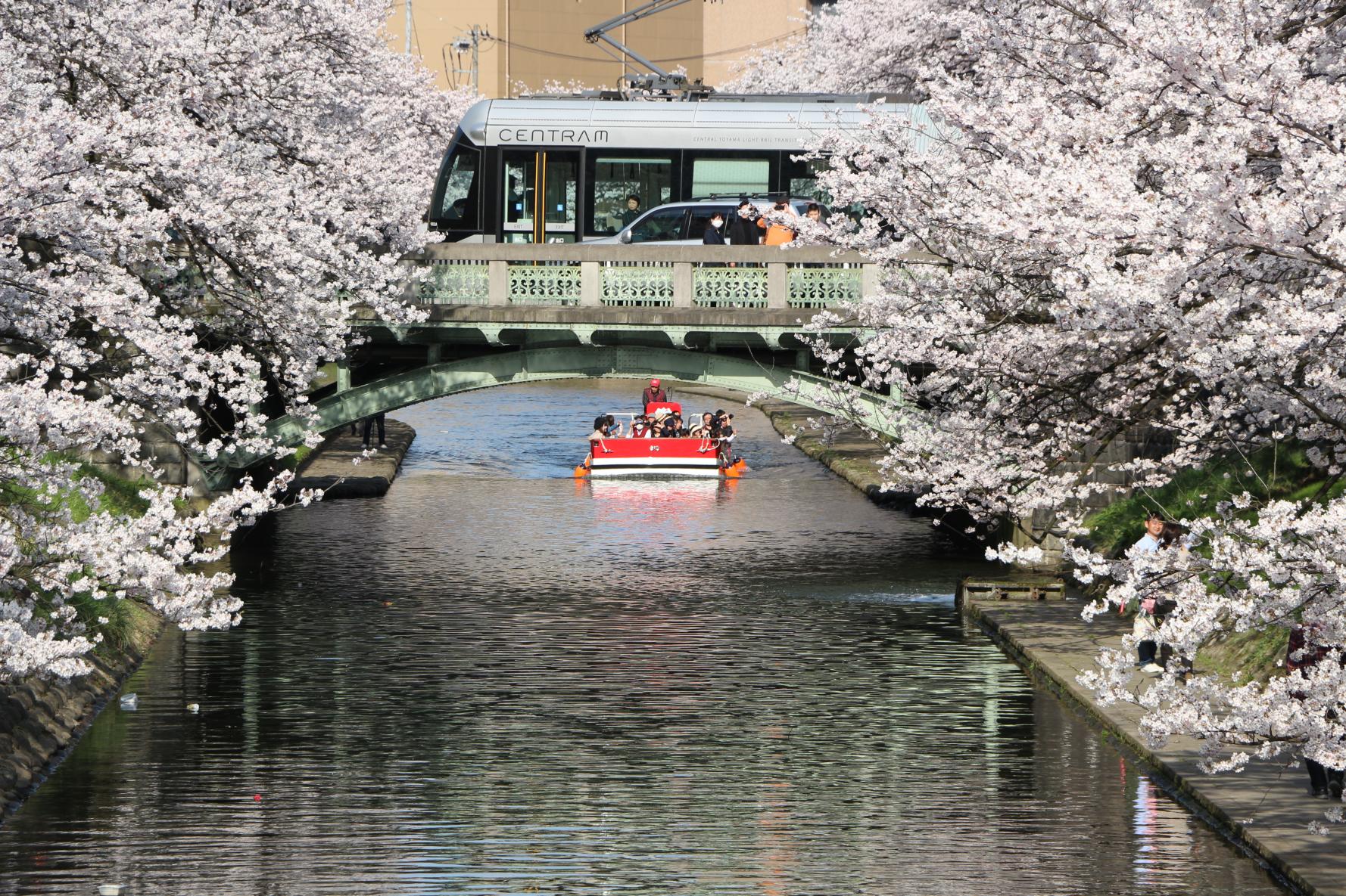 県都・富山市中心部を流れる松川(まつかわ)。桜並木の間をゆっくり航行する遊覧船は、まちなか観光の大切な顔であり、市民にとっては心癒されるふるさとの風景です。