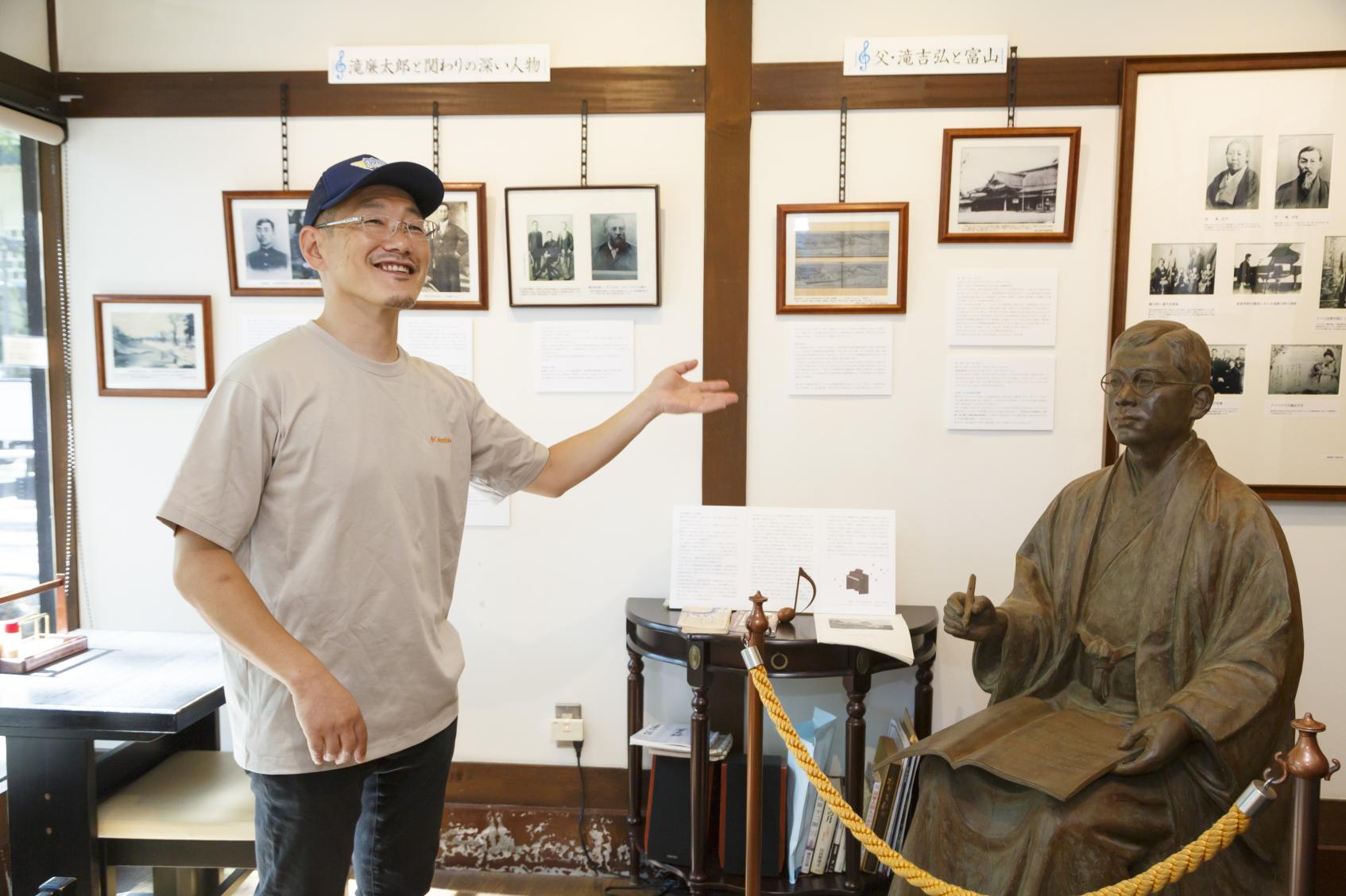 店の一角に「滝廉太郎(たき れんたろう)記念館」を併設し、幼少期を富山で過ごした音楽家・滝廉太郎の生涯を、年表や写真、当時の地図とともに紹介しています。
