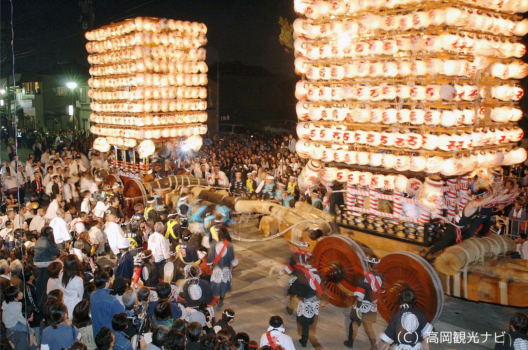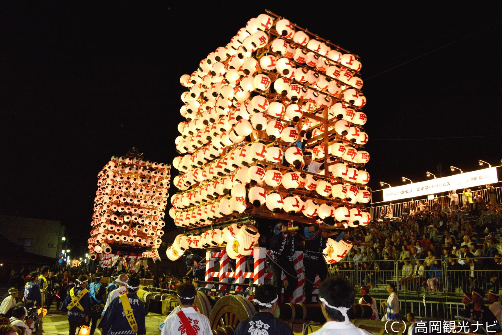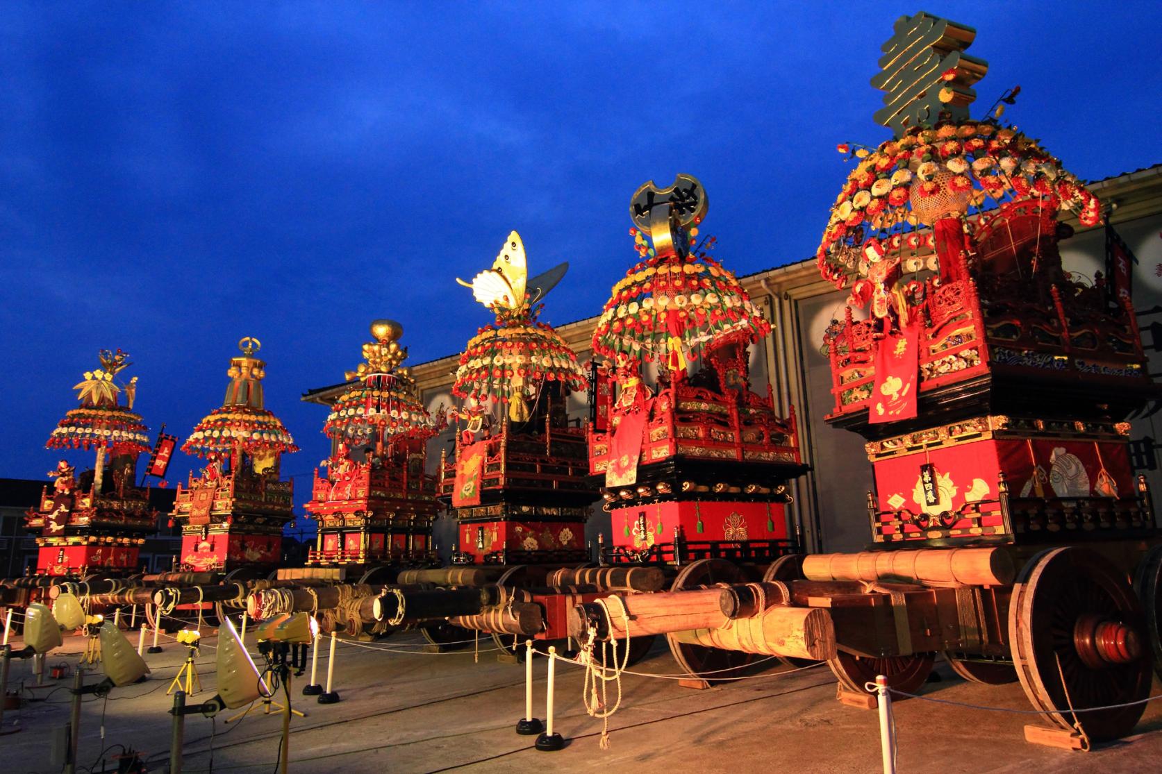 夜になると、山車は「提灯山車(ちょうちんやま)」としてライトアップされ、幻想的な雰囲気を漂わせながら町を進みます。約360個の提灯が山車全体を光り輝かせ、夜の町を華やかに彩ります。