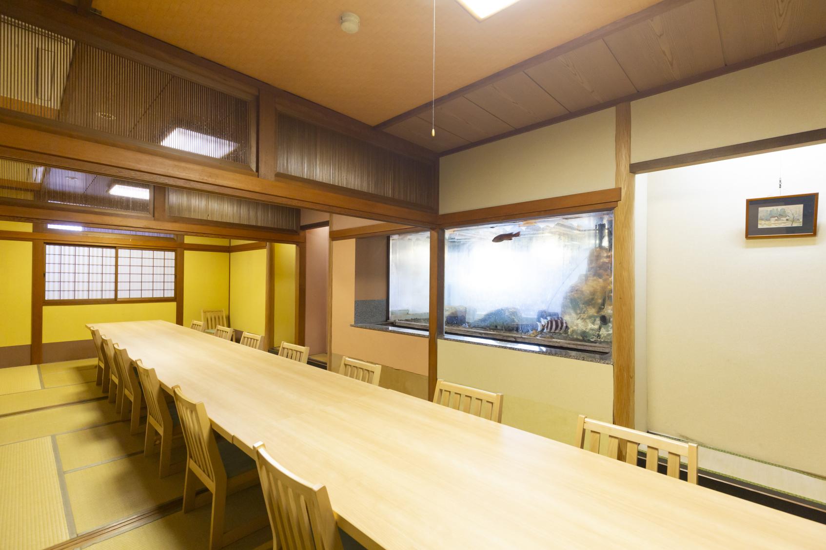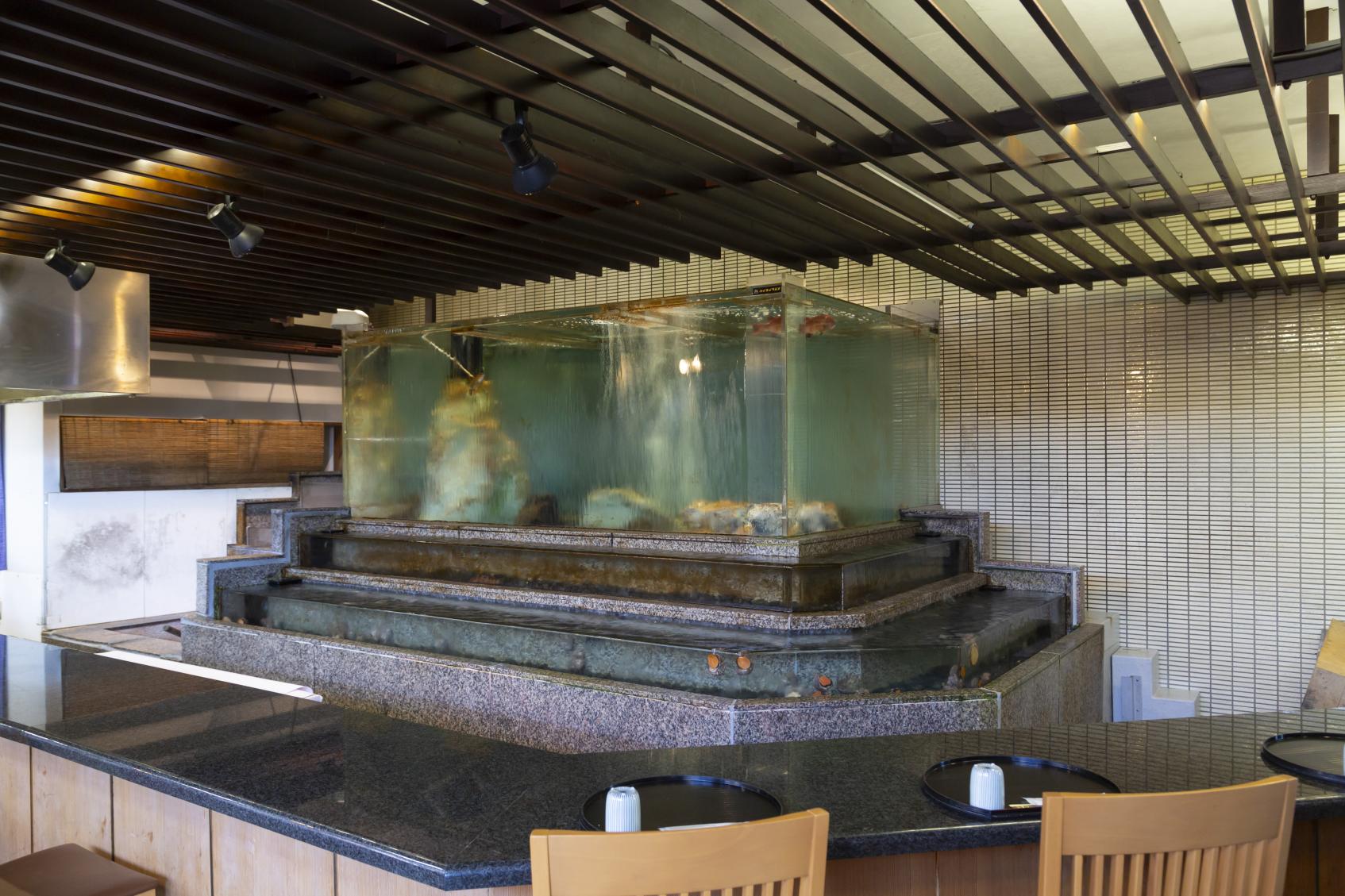 旅館スペースと棟続きにある『海遊亭(かいゆうてい)』は、観光客はもちろん、地元の人の慶事や会食にもよく利用される海鮮レストランです。店内には8トンもの海洋深層水をたたえる大型ひな壇水槽が鎮座します。