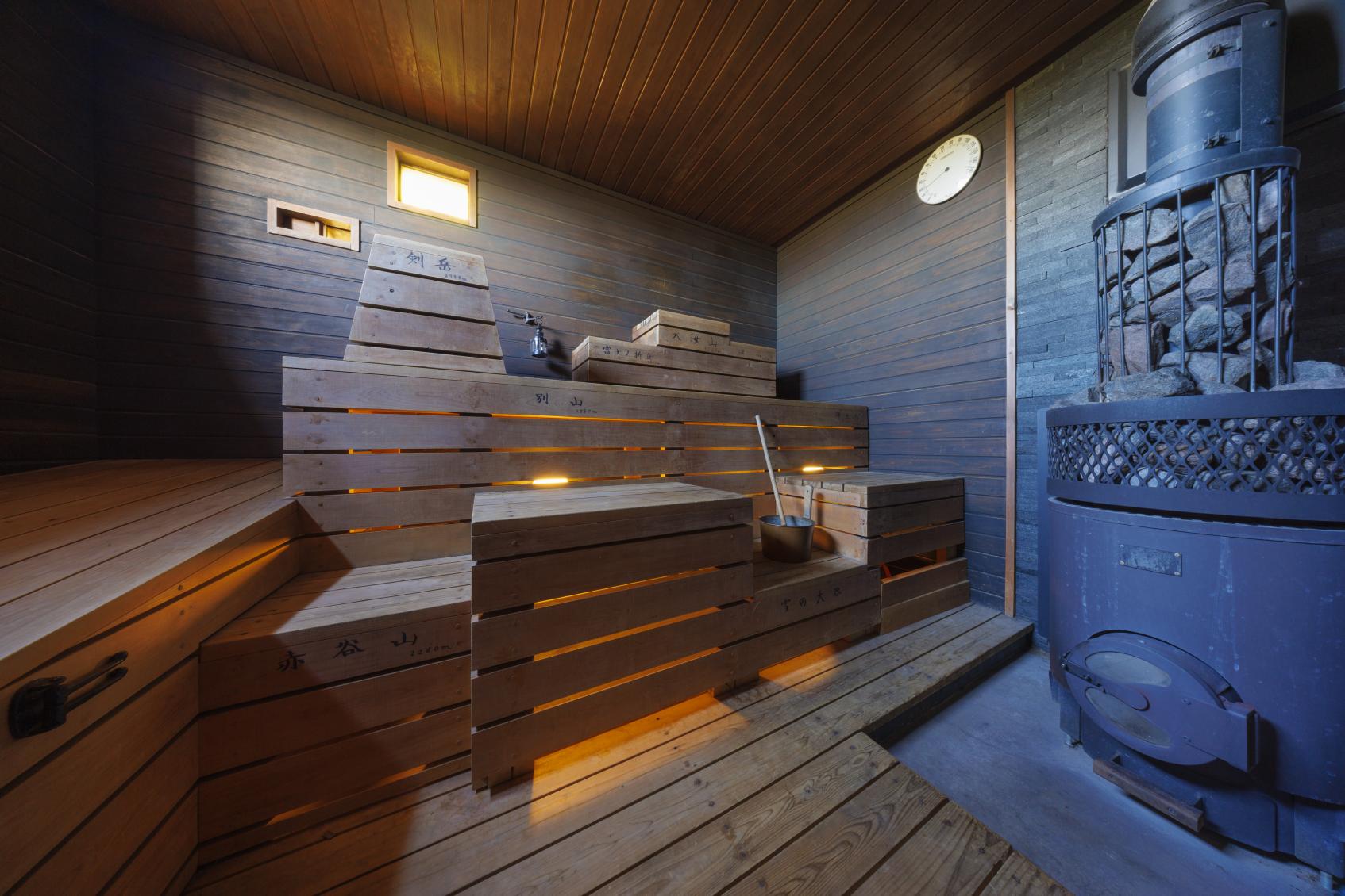 「まるごと立山」をコンセプトにしたユニークなサウナ室は、立山杉を使って作られています。サウナ室内には、立山連峰の雄山、大汝山(おおなんじやま)、剣岳(つるぎだけ)などの山々をモチーフにした、高低のさまざまなベンチが並びます。富山産のサウナストーンと薪ストーブを使った本格フィンランド式サウナを備え、利用者は座るベンチの高さによって異なる温度を楽しむことができます。