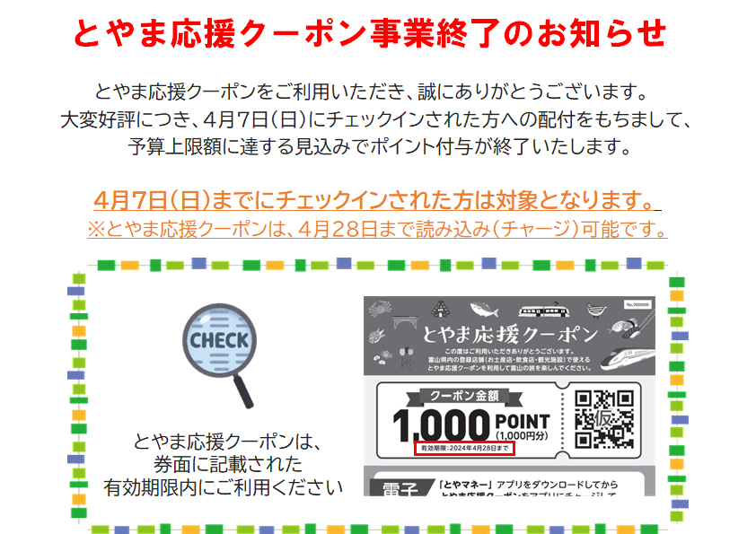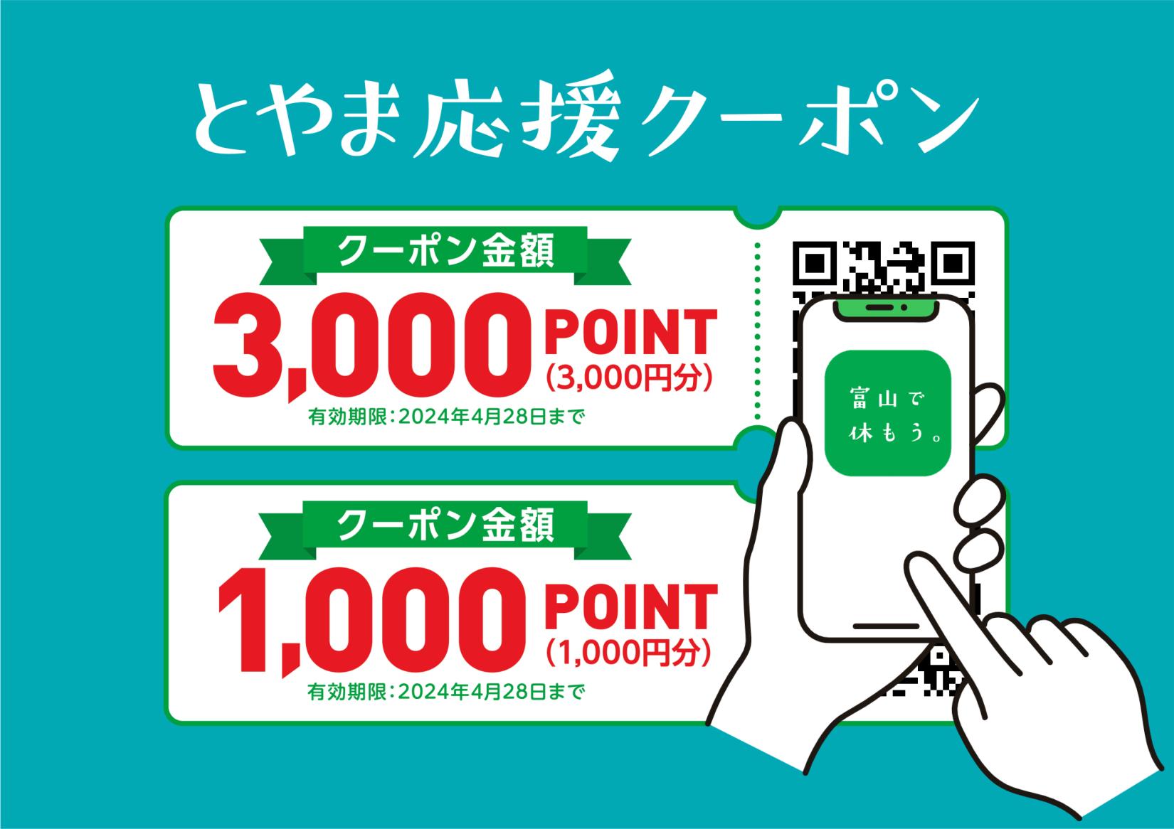 ※とやま応援クーポンは、宿泊日のチェックイン時に配付しております。予約日時点で確約されるものではございません。
