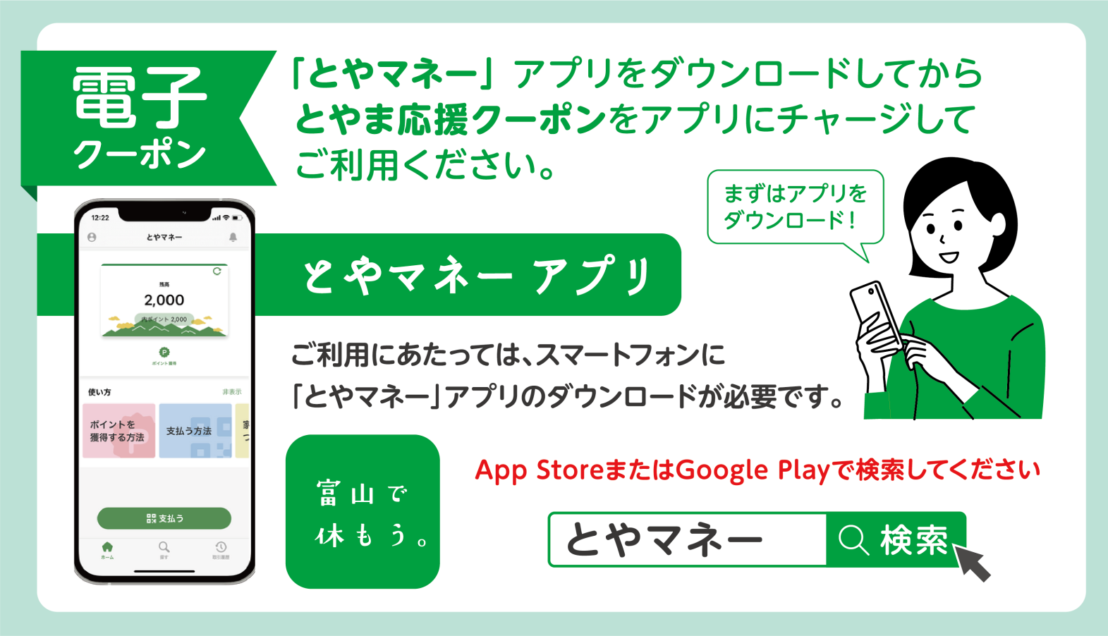 富山県では能登半島地震による風評被害や旅行自粛を払拭するため、国・北陸四県の旅行割引「北陸応援割」に先駆けて、富山県独自に宿泊旅行者への応援クーポン(電子クーポン)を配付し、観光需要を早期に回復させるとともに飲食店や物産店など観光関連産業を幅広く支援します。