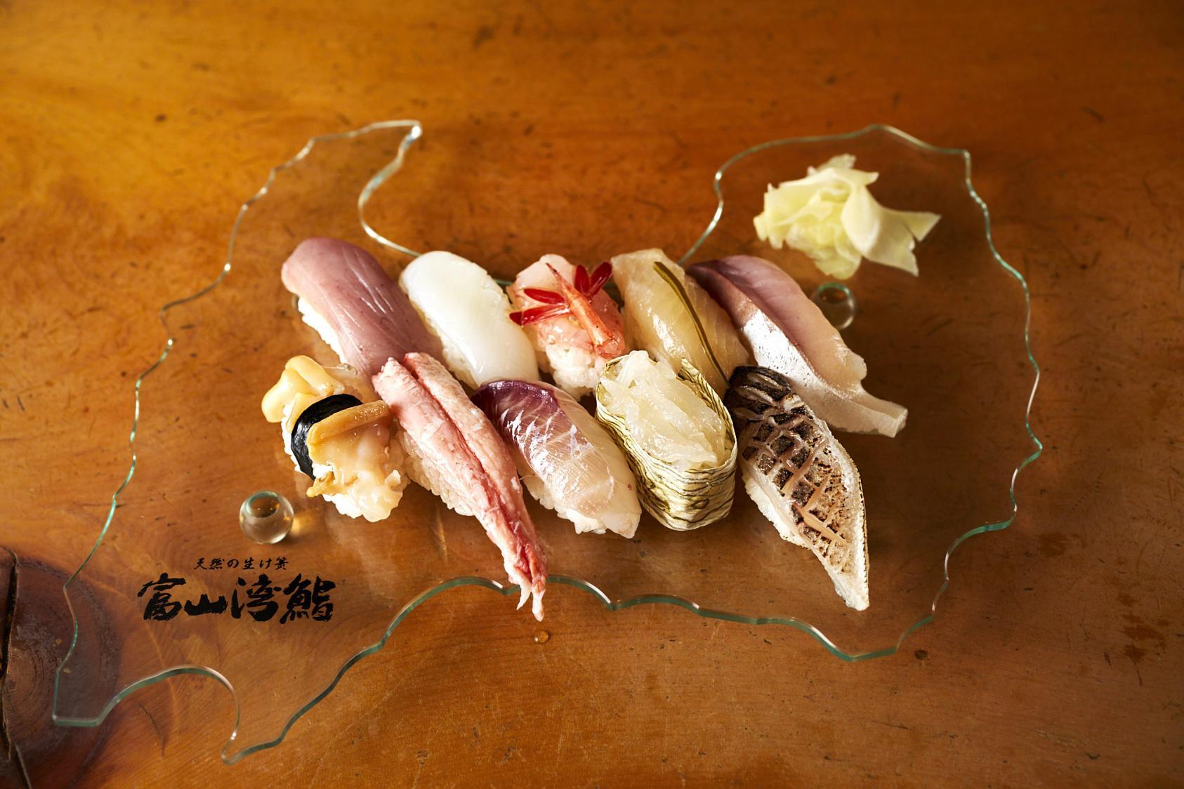 「富山湾鮨」は富山湾の四季折々の獲れたての地魚と、富山県産米のシャリを使った寿司10貫、富山らしい汁物が提供され、富山を訪れた人だけが堪能できるお寿司です。