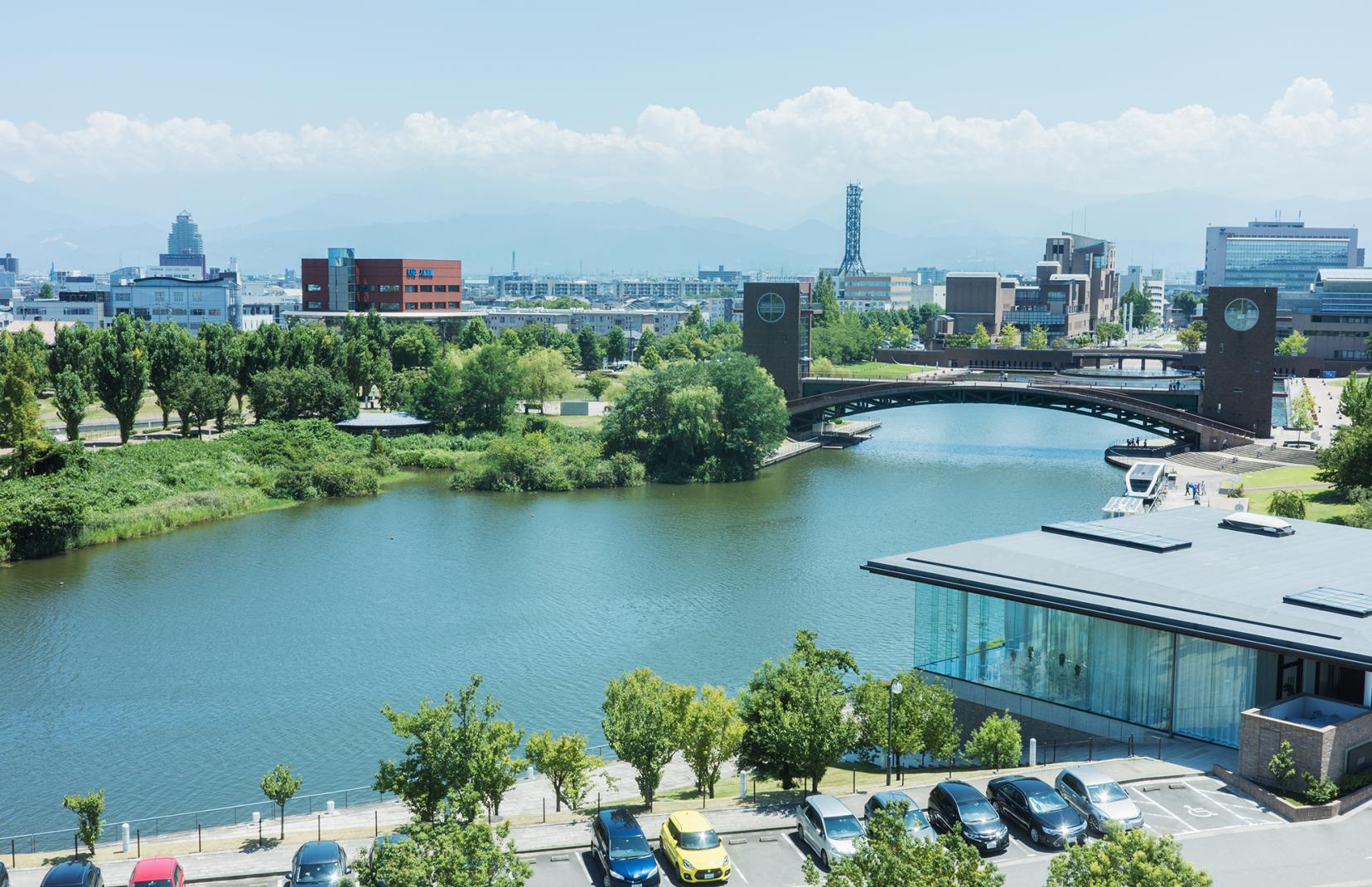 富山駅北口から徒歩15分の場所にある『富山県美術館』は、隣接する「富岩運河環水公園(ふがんうんが かんすいこうえん)」や立山連峰の眺望と地形を生かすように建てられました。
