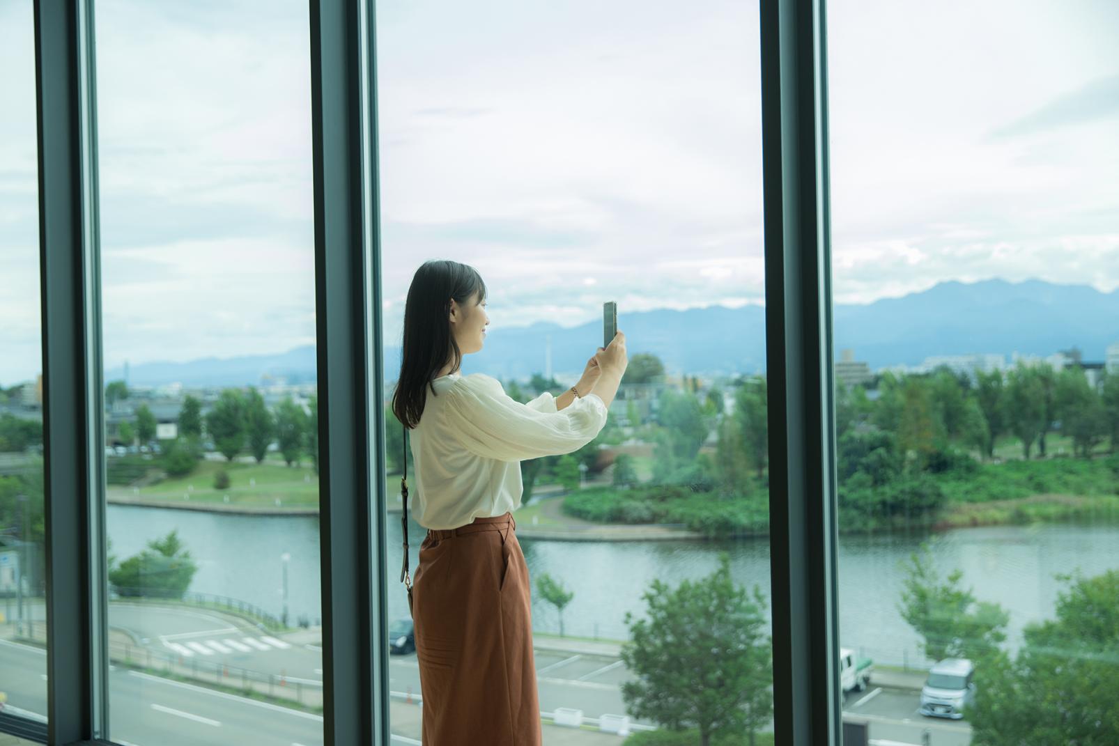 素晴らしい景色を楽しんでもらうために東側は一面ガラス張り。館内は富山県産の「ひみ里山杉」が豊富に用いられた空間です。