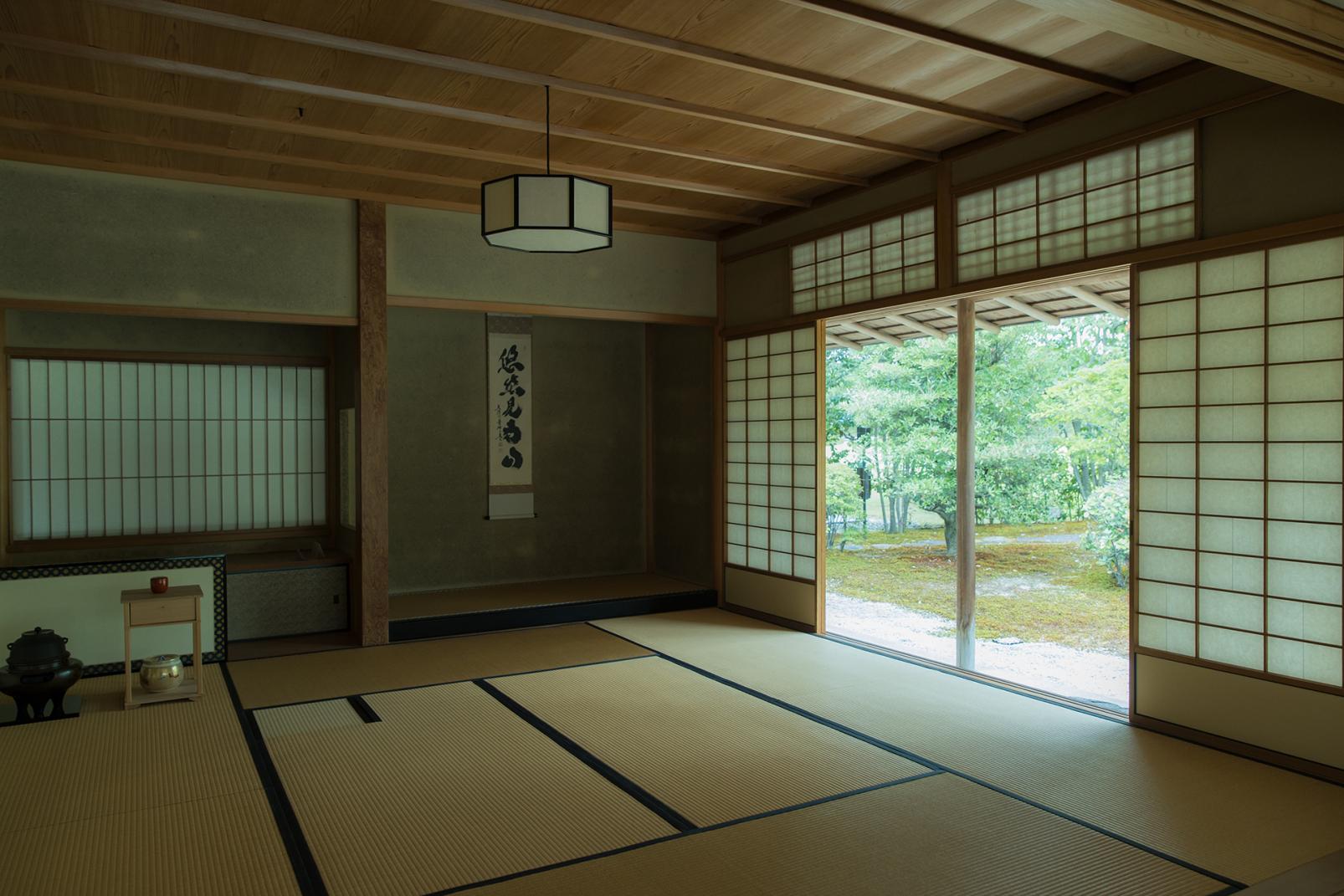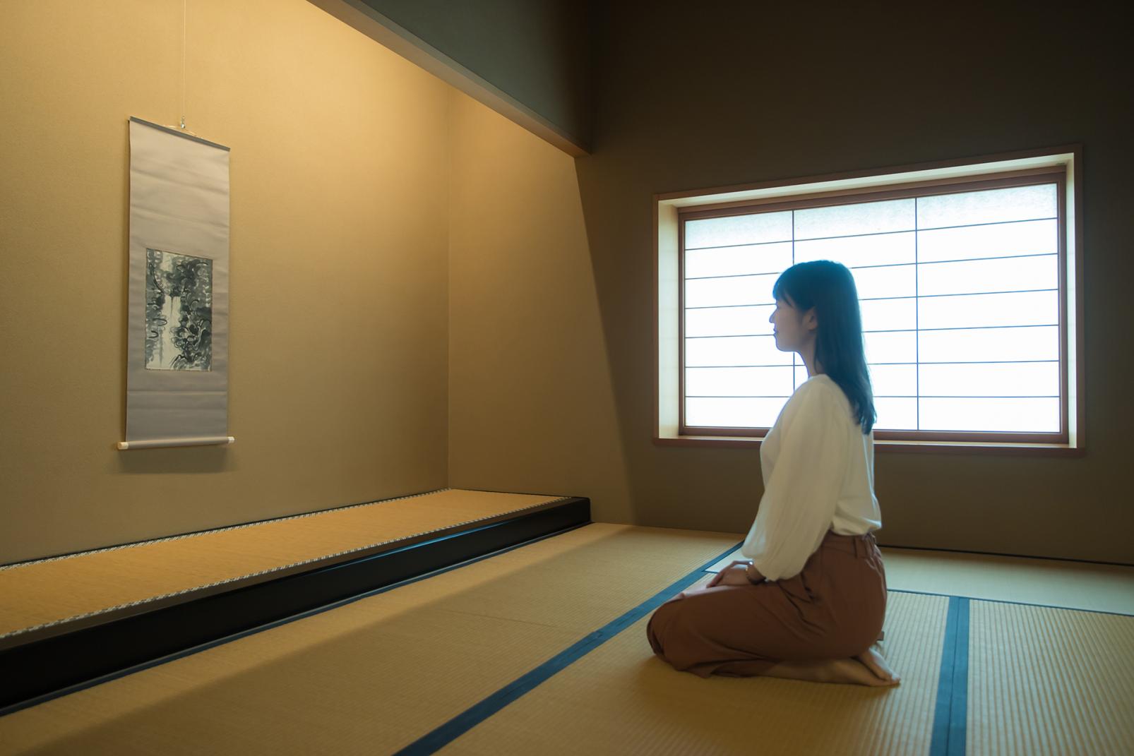 立礼席(りゅうれいせき)と八畳間の和室からなり、軸や釜などの道具は季節によって変わります。