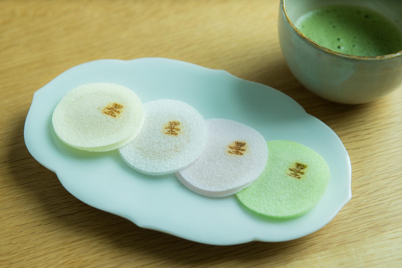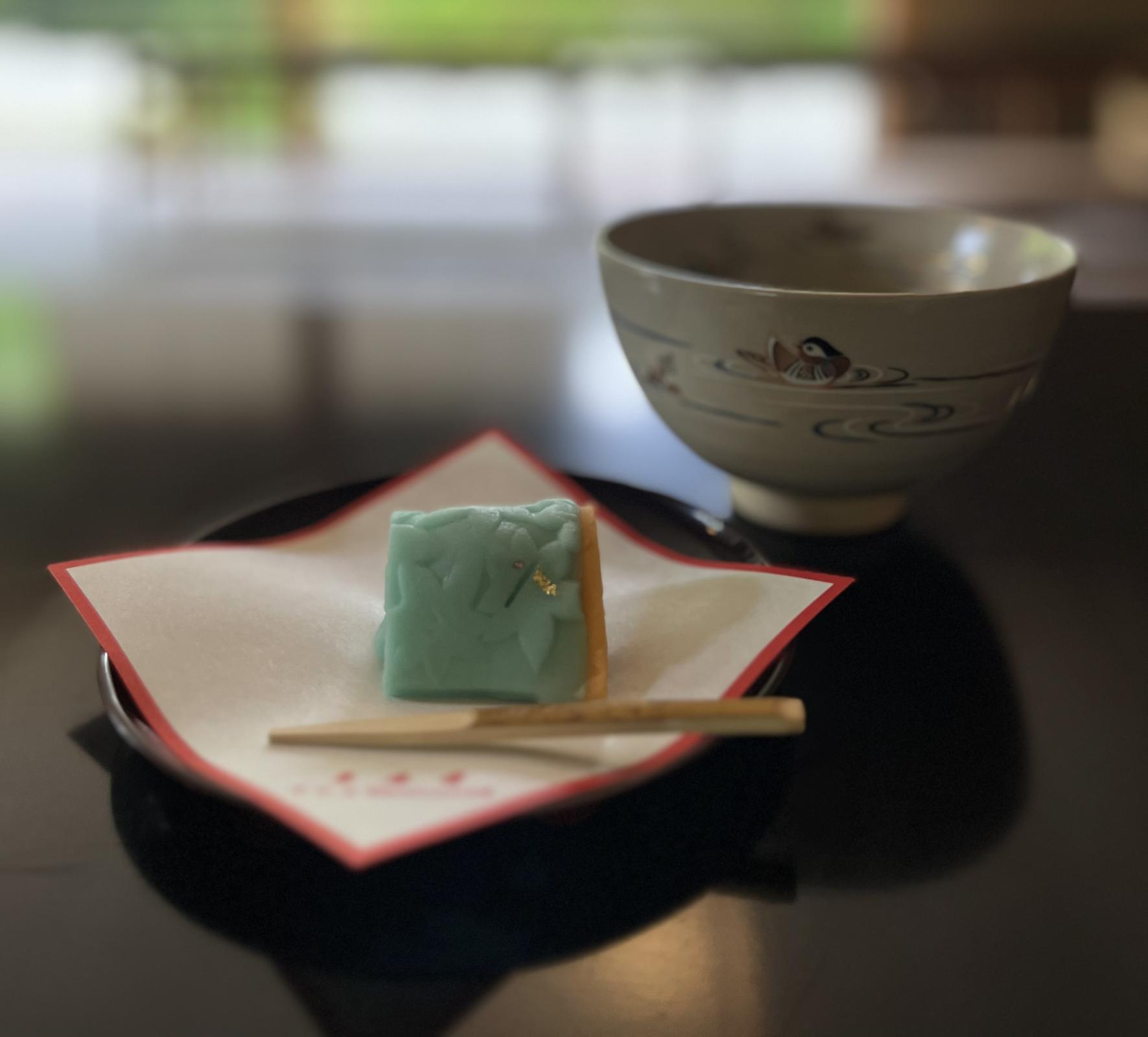 3月~11月中の土・日曜、祝日は立礼の呈茶席が利用できます。抹茶とともに出される上生菓子は、富山市の和菓子店『平安堂』と美術館が一緒に企画展のテーマに合わせて考案しています。