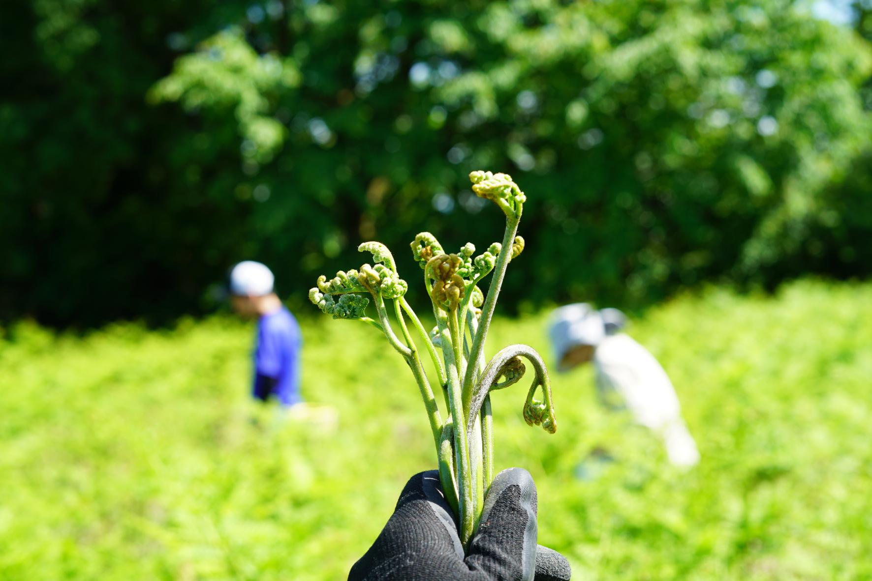 一面にワラビが生い茂り、まるでワラビの楽園。どれもこれも幹が太くて美味しそうです。参加者みんなで和気あいあいと収穫します。