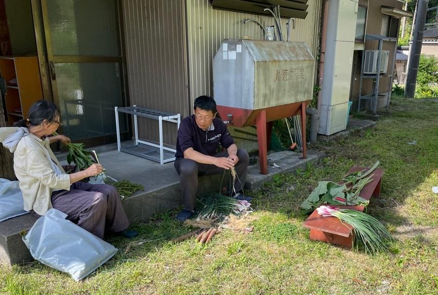 地元の方々が事前に用意してくださったフキの灰汁取りや、エシャロットの皮むきなど、スーパーでは中々みかけない食材の下ごしらえは、普段は感じられない非日常感を味わうことができます。