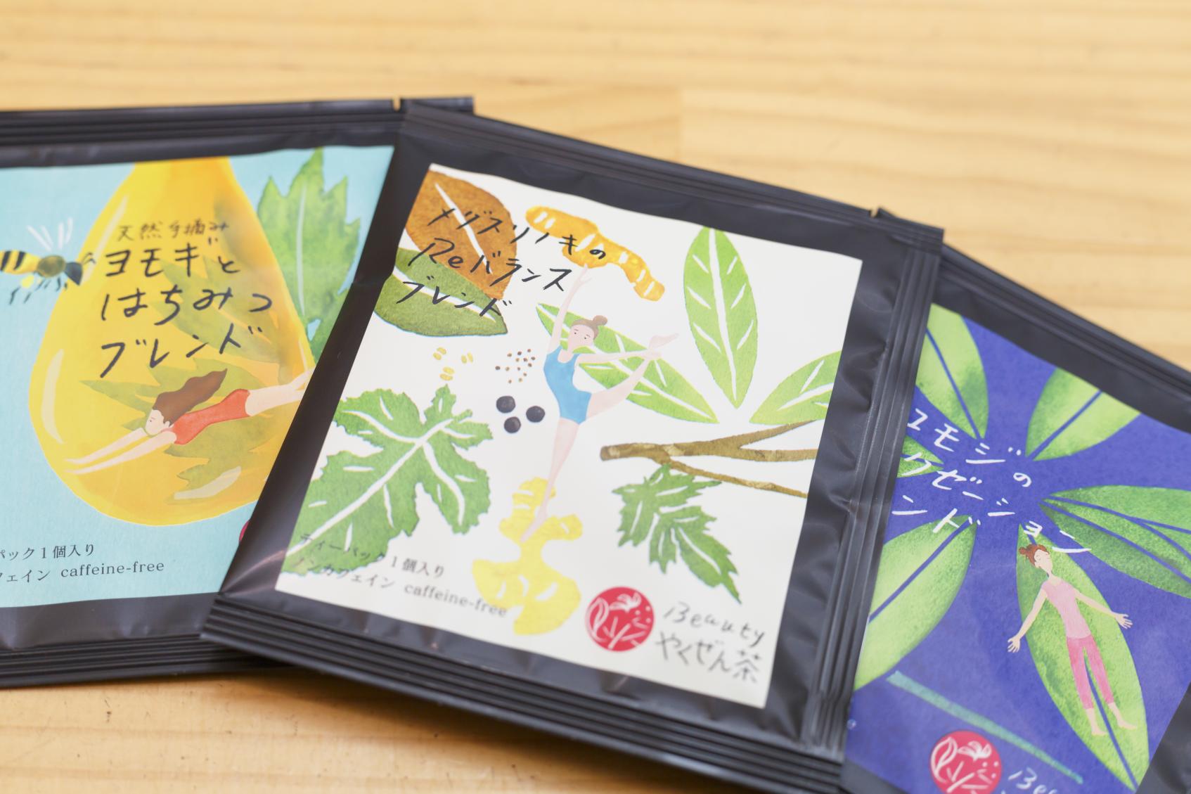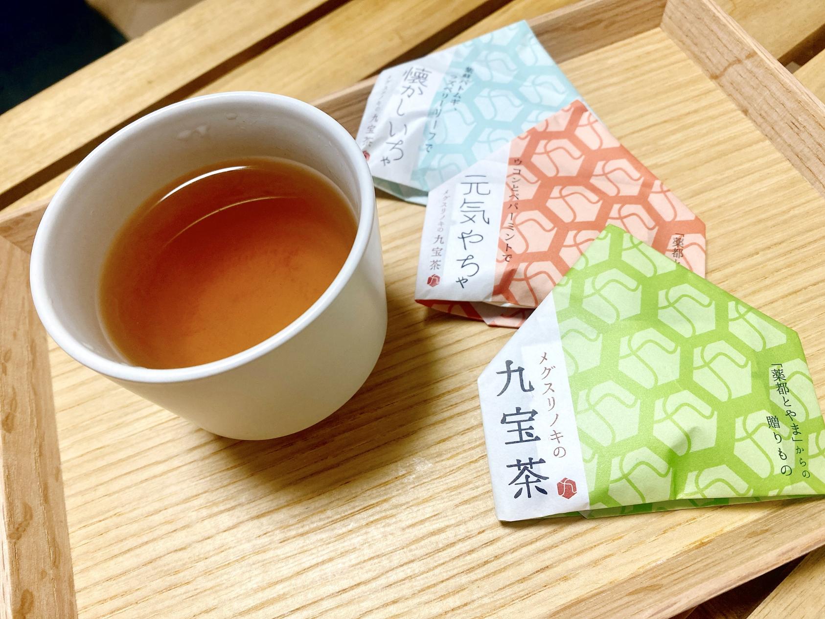 数ある自社開発商品の中でも特徴的なのが、メグスリノキを使った「メグスリノキの九宝茶(きゅうほうちゃ)」や「Beautyやくぜん茶」などのお茶です。