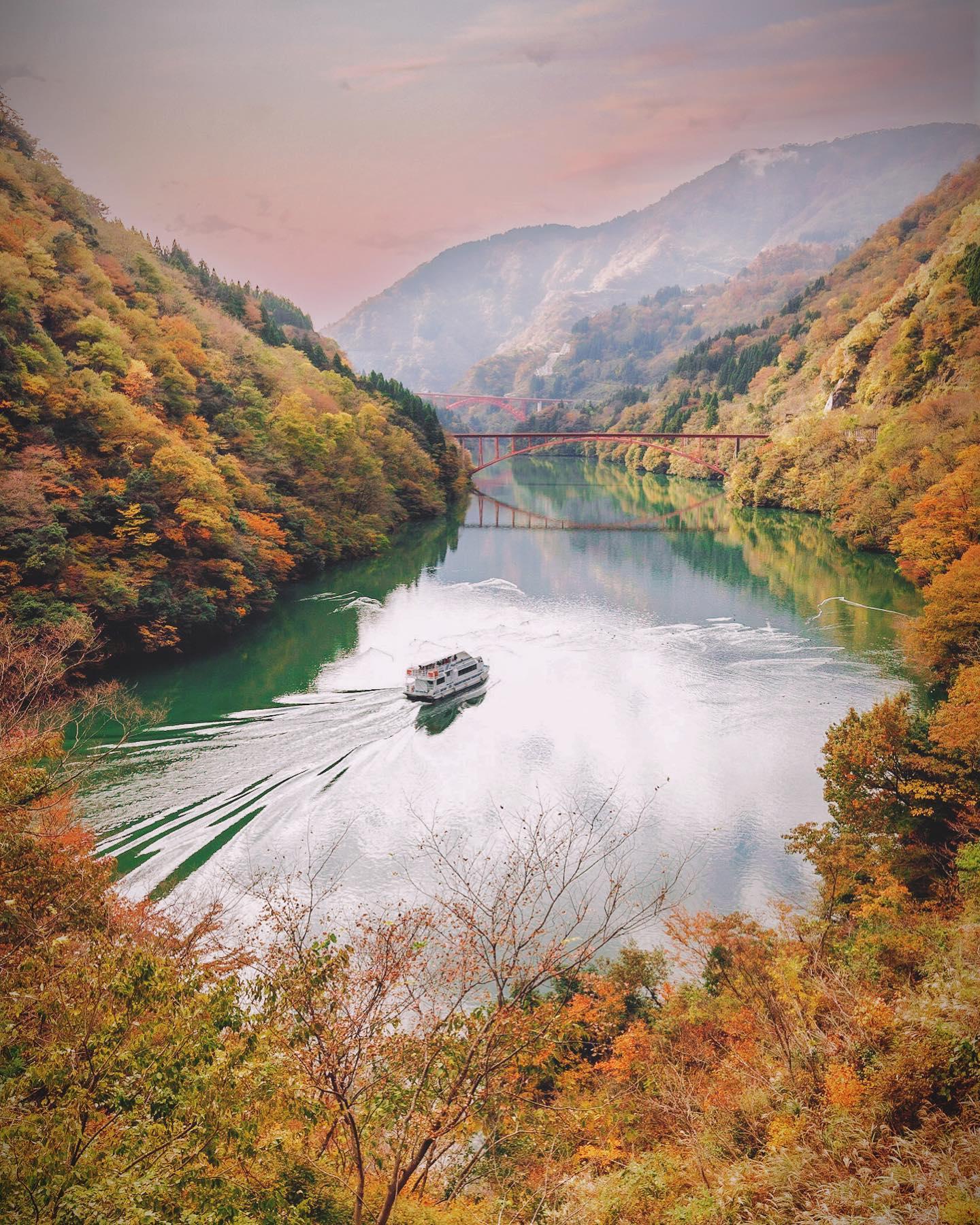 鮮やかな紅葉と深く透き通った川、切り立った岩肌のコントラストが映える秋の神通峡。雪解け水が激流となり、V字型にするどく切れ込んだ造形の「片路峡(かたじきょう)」はひと際ダイナミックな見所のひとつで、人気の紅葉スポットとしても有名です。