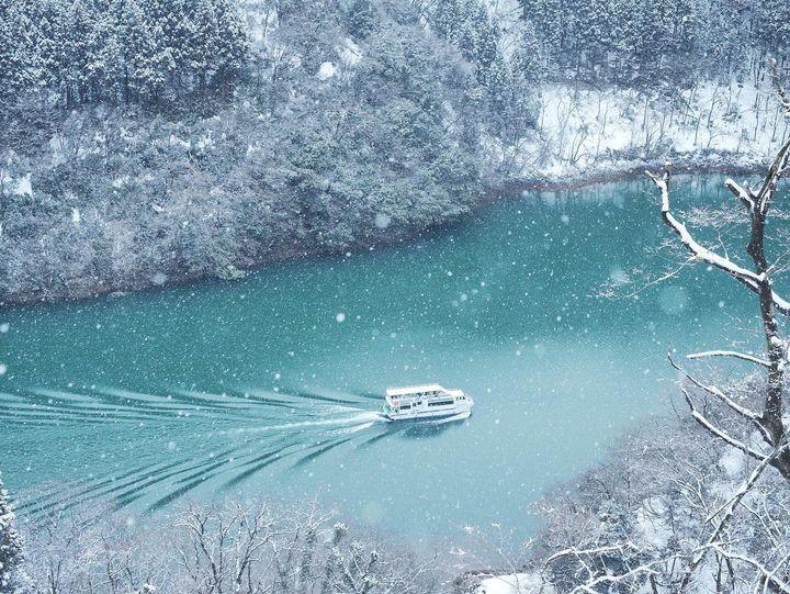 県定公園にも指定されている庄川峡。冬本番の雪に覆われた庄川峡は、まるで水墨画を思わせる大パノラマが広がっています。おすすめは小牧ダム付近から庄川峡を周遊する観光遊覧船。暖かい船内から眺める雪景色と湖面のコントラストは眼福の一言です。
