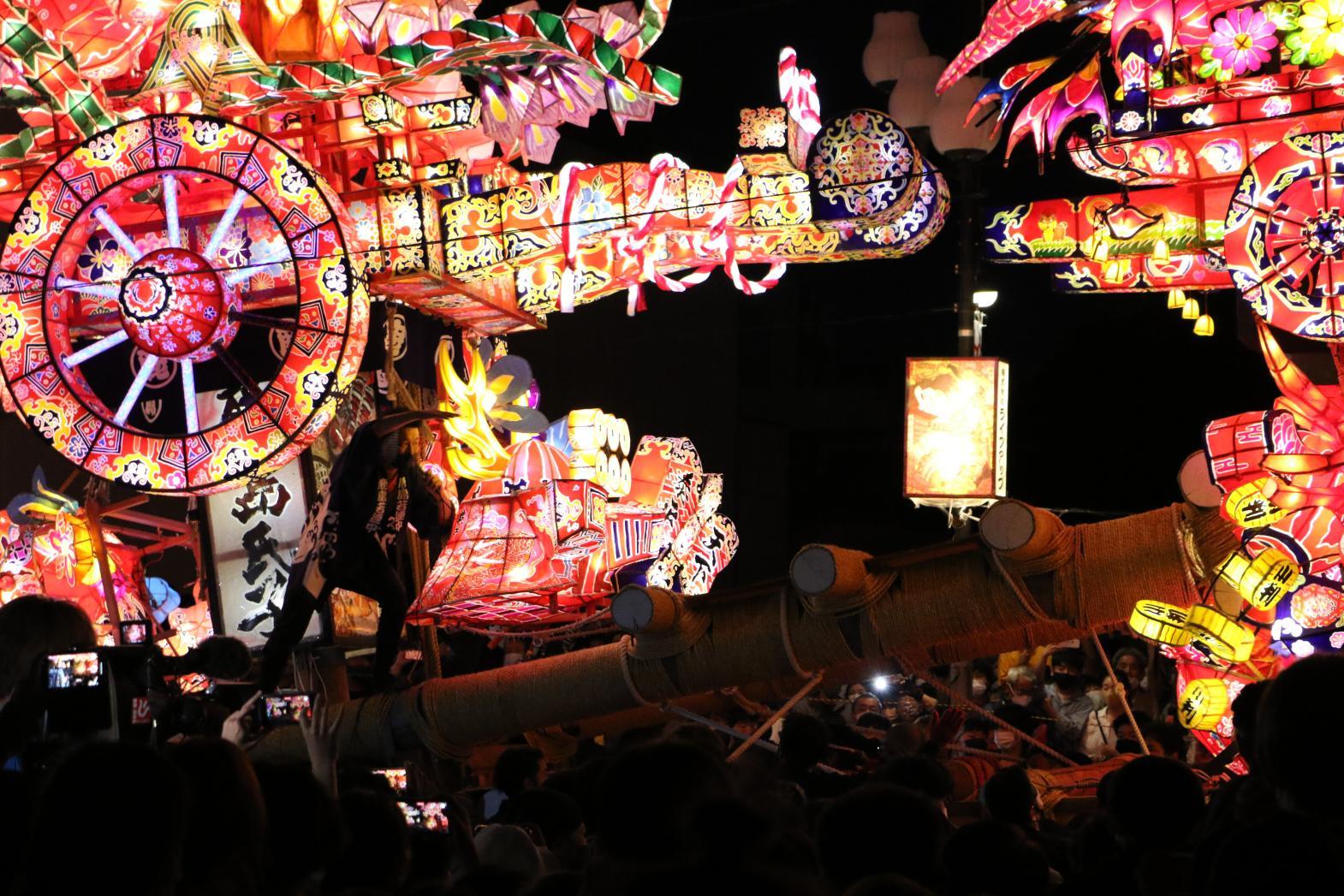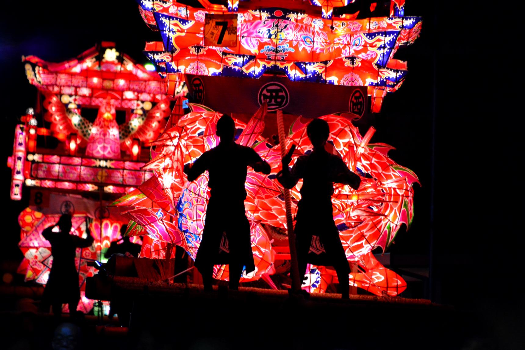 勇壮な夜高行燈(よたかあんどん)をはじめ、夜空に舞う花火、たいまつ行進など、華やかな光のファンタジーが繰り広げられます。夜高行燈のぶつかり合いも大いに白熱します。 -