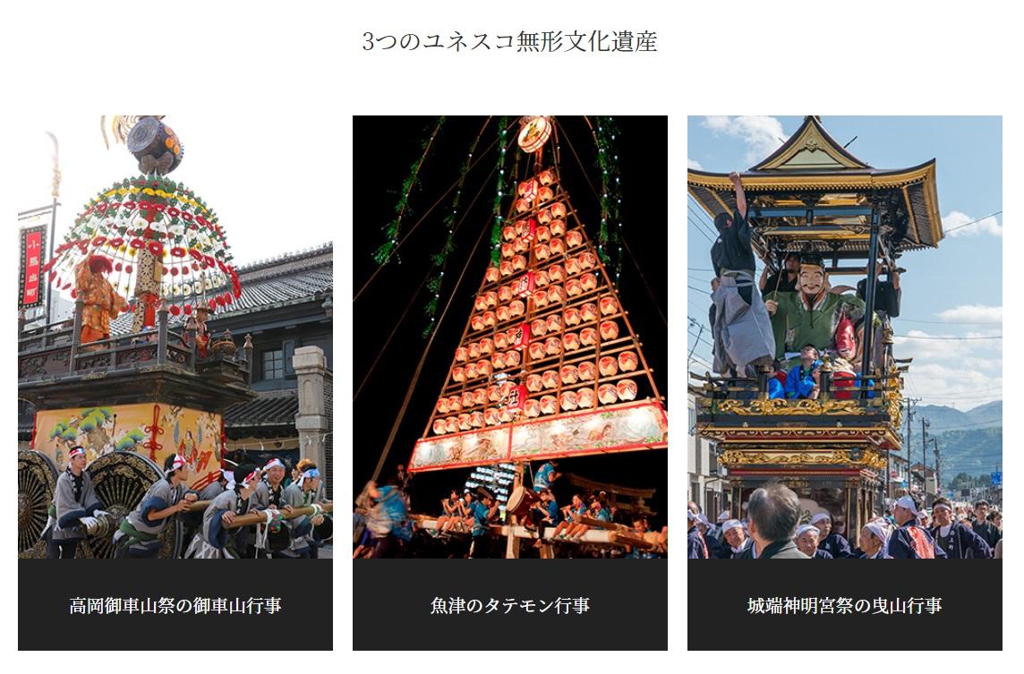 2016年に、富山県にある3つの祭りがユネスコ無形文化遺産「山・鉾・屋台行事」に登録されました。「高岡御車山祭の御車山行事」「魚津のタテモン行事」「城端神明宮祭の曳山行事」です。