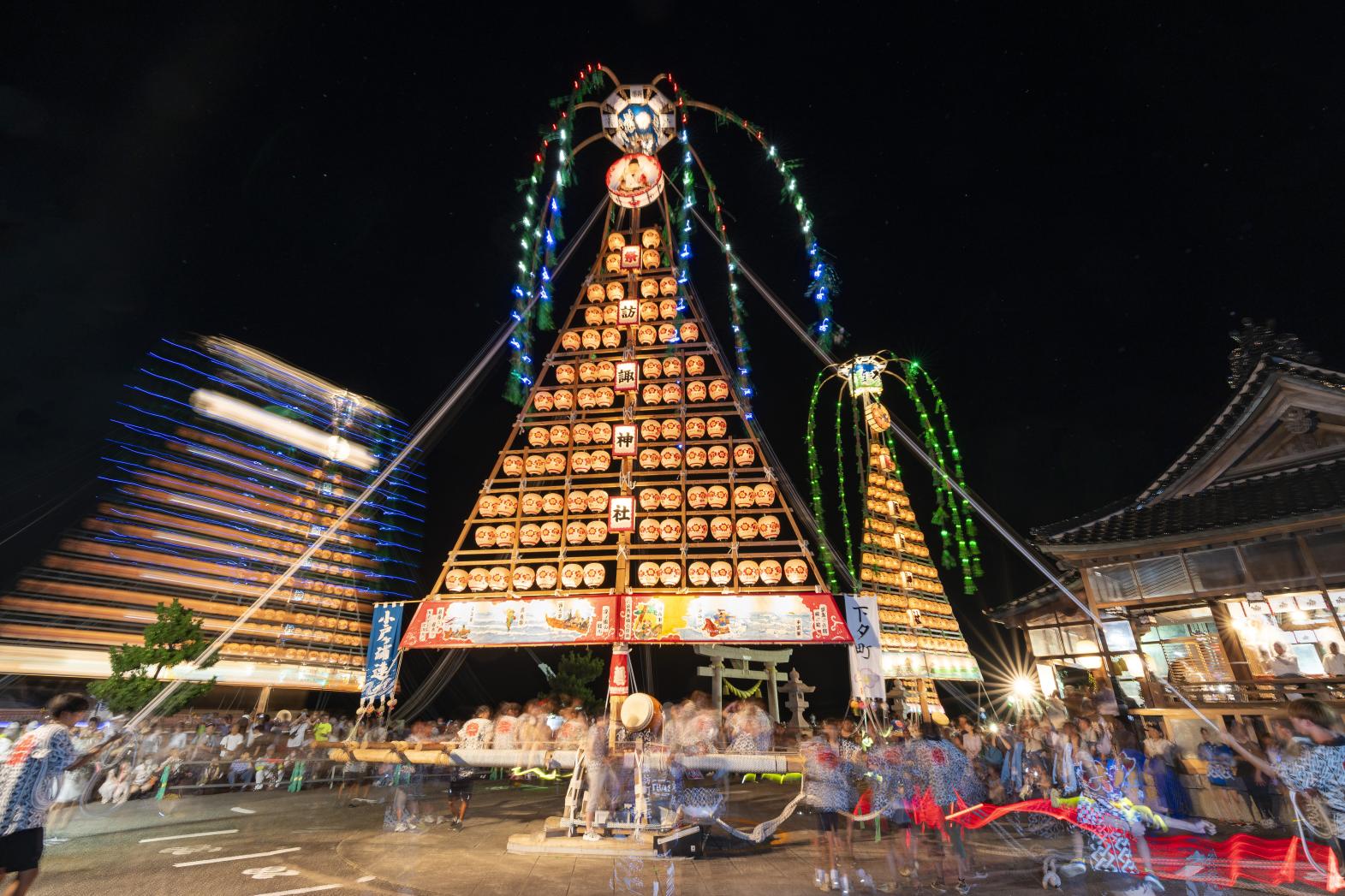 海の安全と豊漁を祈願する祭礼で「たてもん」と呼ばれる行燈が曳き回されます。たてもんは、風を受けた船の帆を見立てており、ソリ状の台に約15mの木を立て、90余りの提灯や行灯が吊り下げられています。7基のたてもんが諏訪神社の広場で順々にグルグルと回される姿は大迫力で、地元の夏の夜を彩る風物詩にもなっています。