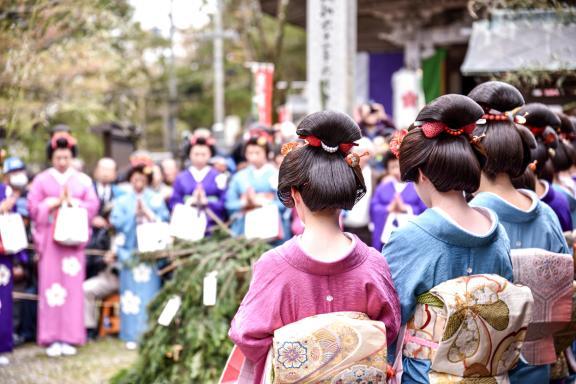 芸妓の数が少なくなったため衰退していましたが、1987年から独身の女性を対象に一般公募を始めました。花笠童子、太鼓台や稚児、神輿に続いて、ピンクや水色、紫の着物に丸髷姿の未婚女性が、氷見市中心部の商店街を通り千手寺までを練り歩きます。外国人の参加者もいて、大きな賑わいを見せています。