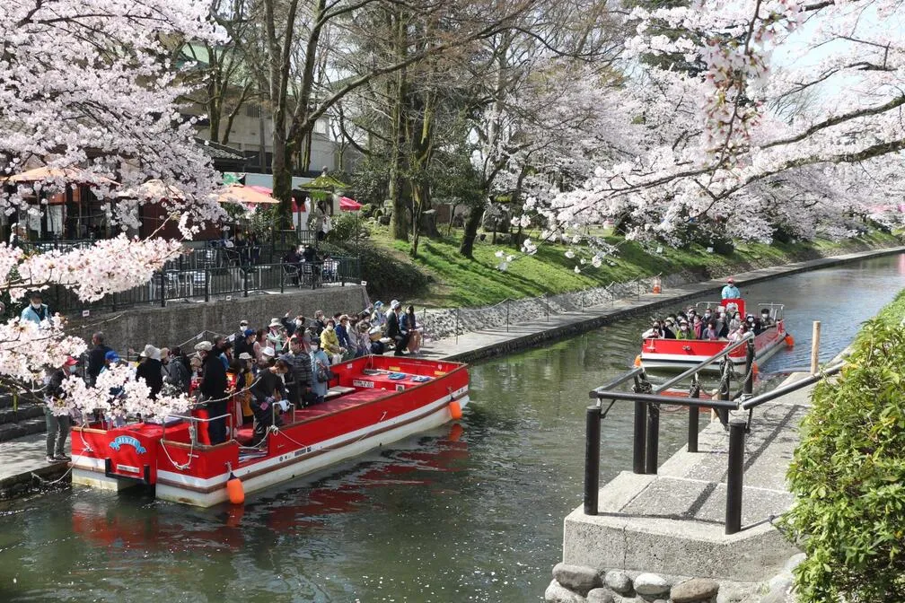 富山城址公園内の「松川茶屋」を発着する「松川遊覧船」。日本さくら名所100選に選ばれた松川の桜のトンネルを抜ける春、新緑まぶしい夏、紅葉の秋、雪景色が美しい冬と、四季折々の表情が見られます。