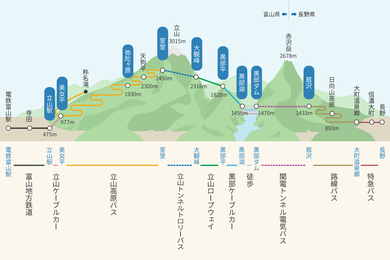 立山黒部アルペンルートは、3,000m級の北アルプスを貫き、富山と長野を結ぶ山岳観光ルートです。