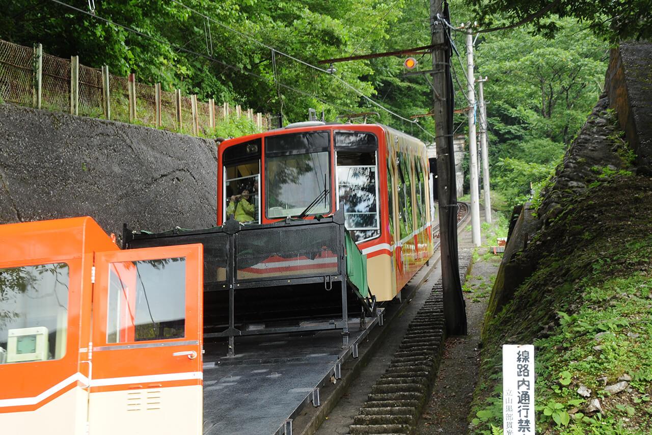 立山ケーブルカーは、かつて黒部ダム建設用の資材を積んでいたので、ケーブルカーには珍しく荷台がついています。