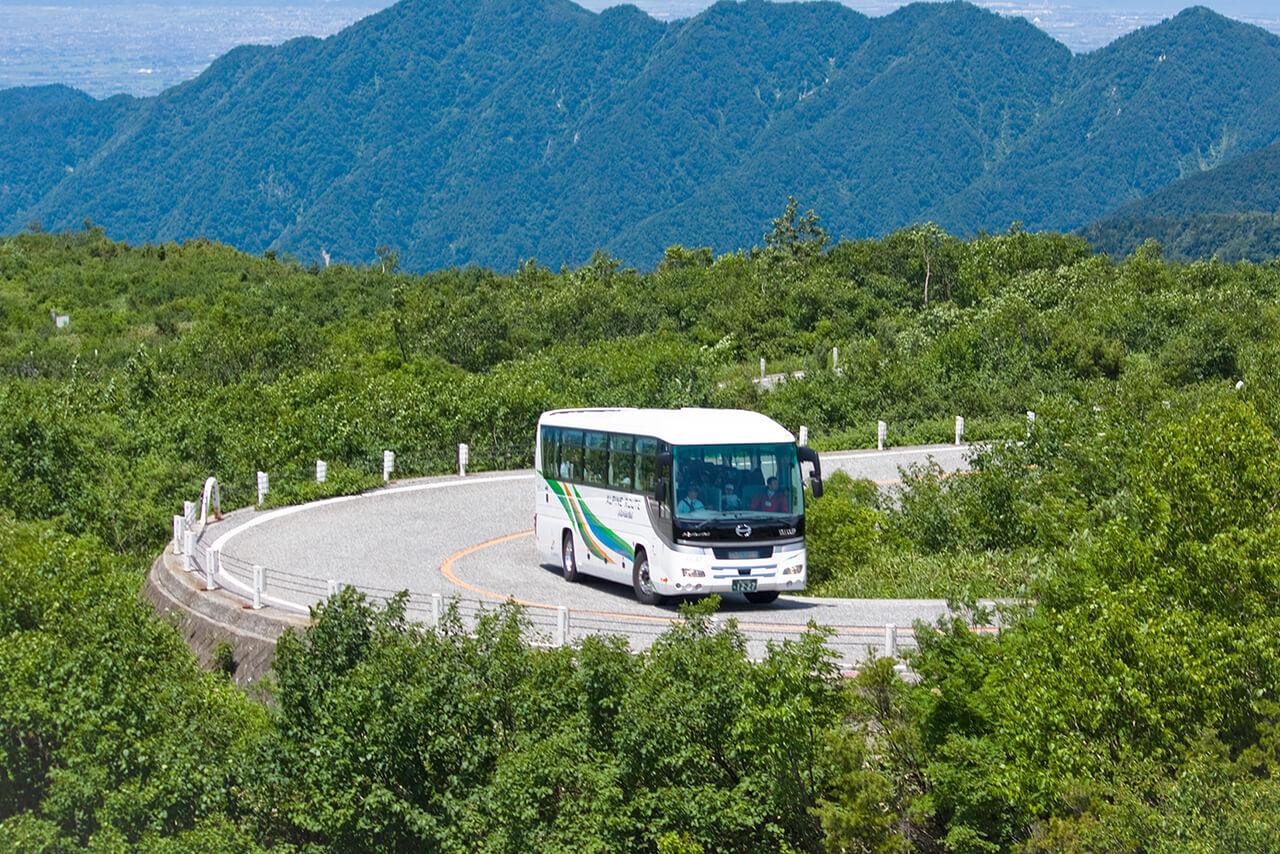 現在の立山高原バスは、環境にやさしい車両となり、約1,500mの標高差を登っていきます。