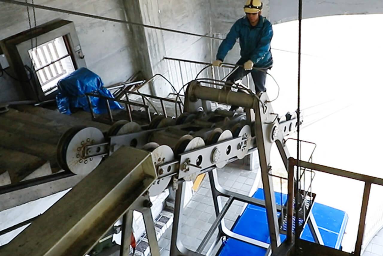 山頂側にある運転室で、ロープの複雑な操作を行っています。