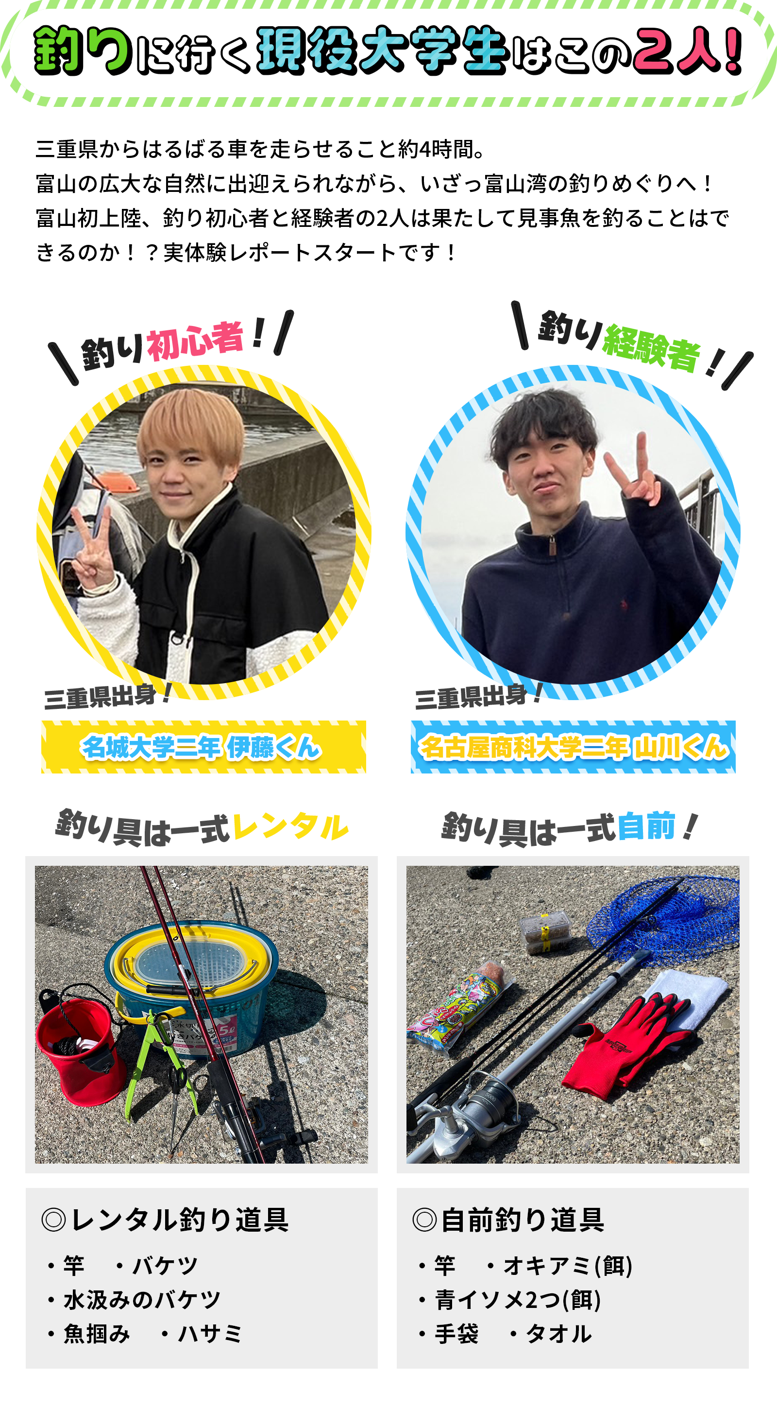釣り初心者と釣り経験者の現役大学生の2人が、初めて来た富山湾で釣りめぐり!釣り具のレンタルから有名な釣り場スポット、そしてホタルイカの身投げを見に行きました。