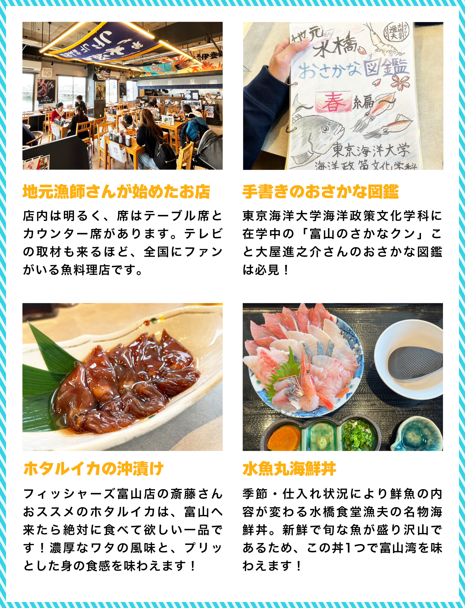 水橋食堂漁夫は地元の漁師が運営するお店で、水橋漁港でとれた新鮮な富山湾の海の幸をふんだんに使った料理を提供しています!