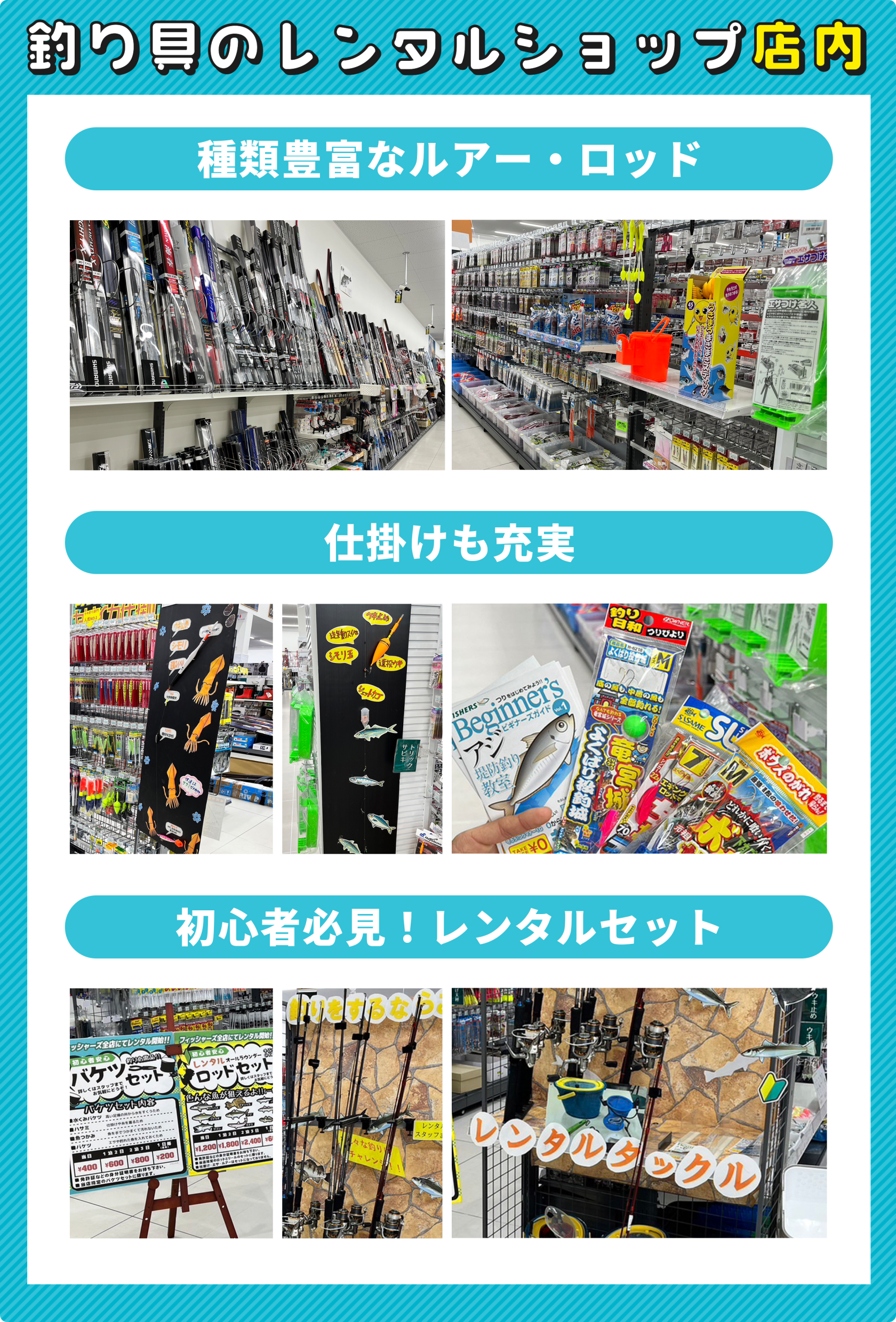 そして店内の至る所に張り出された手作りのPOPは、魚と釣り人への愛を感じられるほど細部まで凝っていて、クオリティがとても高いです!釣り初心者でも店内にいるだけでワクワクを感じられます。そんなお店に居心地の良さを感じながら店内めぐりをしていると!初心者のためのレンタルセットがありました!