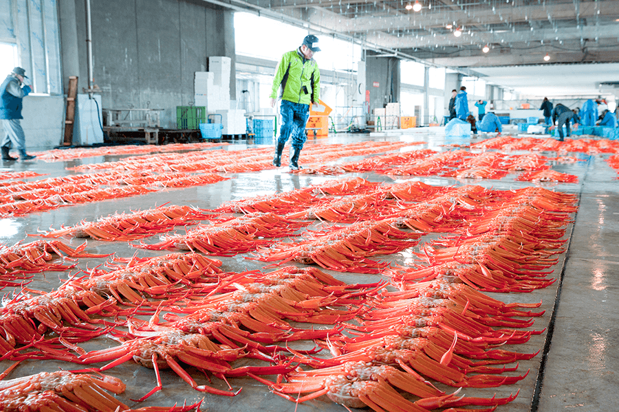 なかでも9〜5月には「ベニズワイガニ」漁が解禁。水揚げされるベニズワイガニが、まるで赤いじゅうたんのように並べられる光景は圧巻。最近では、富山湾で水揚げされるベニズワイガニは「高志の紅ガニ」としてブランド化され、さらに注目をあつめています。