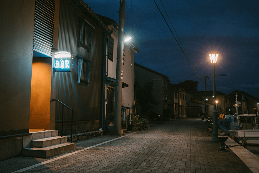 「『BRIDGE BAR』を目的にぜひそぞろ歩いてみてください。夜の散策もまた別の景色が楽しめますよ。」とあおいさんは話します。墨汁のようにまっくろになった内川に街灯の光がうつると、どこか異世界のような、夢のような雰囲気に包まれます。