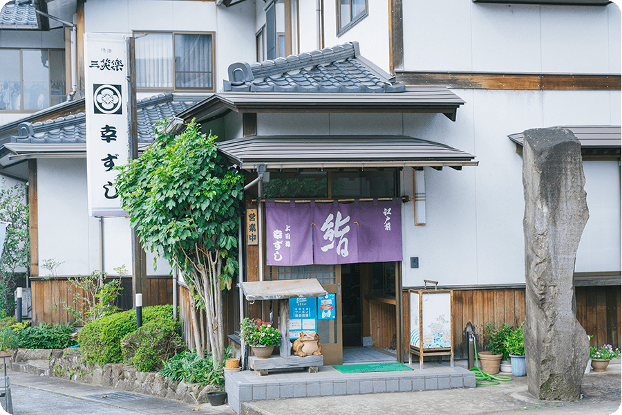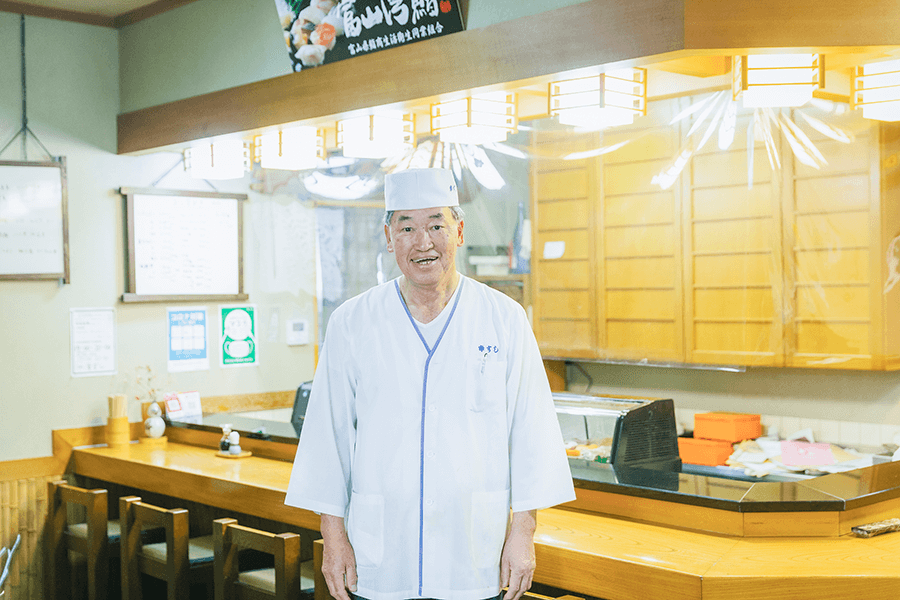 南砺市城端(じょうはな)は「城端別院 善徳寺」の門前に広がる小さな町です。江戸時代から加賀絹の産地として栄え、生産が活発に行われていたころは町の至る場所から機織りの音が響いていました。「城端別院 善徳寺」の斜向かいにある「幸ずし」は、昭和35年に店主の窪田幸司さんの父が開業しました。南砺地区は海に面しておらず、山に囲まれた町。「当時は城端線の沿線で鮨を専門に出す店はありませんでした」と窪田さん。金沢で修行をして店に入り、現在は、家族と一緒に暖簾を守っています。