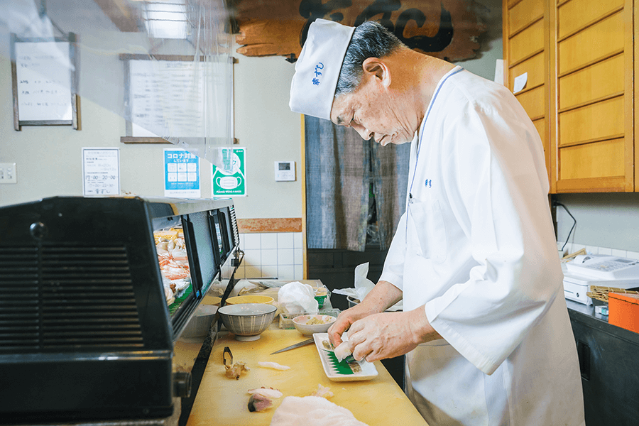 握るのは地元の魚屋から仕入れた新鮮な海の幸。氷見や新湊など、富山県内の複数の港に水揚げされた旬の活魚を扱っています。自家製のシメサバは特に人気が高く、塩で旨味を引き出し、ほどよく酢をなじませます。(バッテラ押しずし 1本1,540円)シャリにも定評があり、地元で収穫された2品種の米をブレンドして炊き上げています。少し甘めの合わせ酢が「幸ずし」の魅力のひとつ。「父親が創業した60年前からのやり方を守って、昔の味を変えないように仕事をしてきました」と窪田さん。
