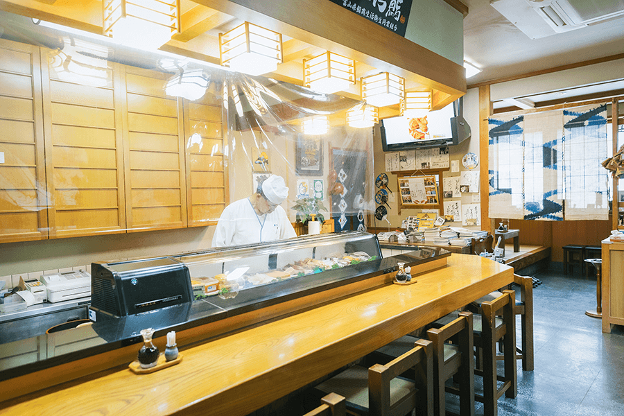 昼はランチタム限定の「すし定食」(1,100円)や「海鮮丼」(1,700円)(どちらも味噌汁・デザート付き)が好評です。また夜も一品料理や「盛り合わせずし」(1,650円~)、「特上にぎりずし」(3,630円)などで迎えてくれます。県外のお客さんには「富山湾鮨」(2,970円)が好評です。夜は地酒を目当てに訪れる人も多く、五箇山で醸す「三笑楽」は大吟醸や純米酒などさまざまな種類を揃えています。ほかにも地酒は「立山」があり「シャリが甘めの鮨には、辛口の酒がよく合う」と話します。お客さんは長い付き合いの方が多く、地元で愛されていることが伝わってきます。