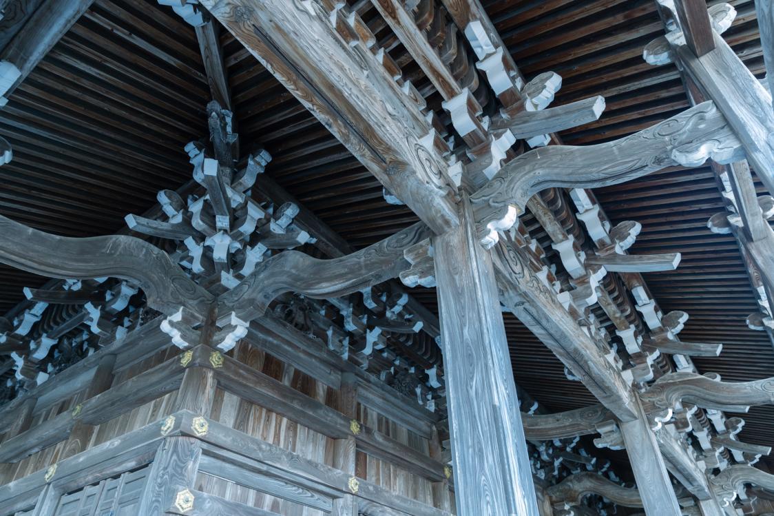 京都にある本願寺の宮大工が関わった建築も見応え十分。境内から本堂を見上げると、木鼻(きばな)や手挟(たばさみ)など、随所に精緻な装飾彫刻が施してあるのが分かります。