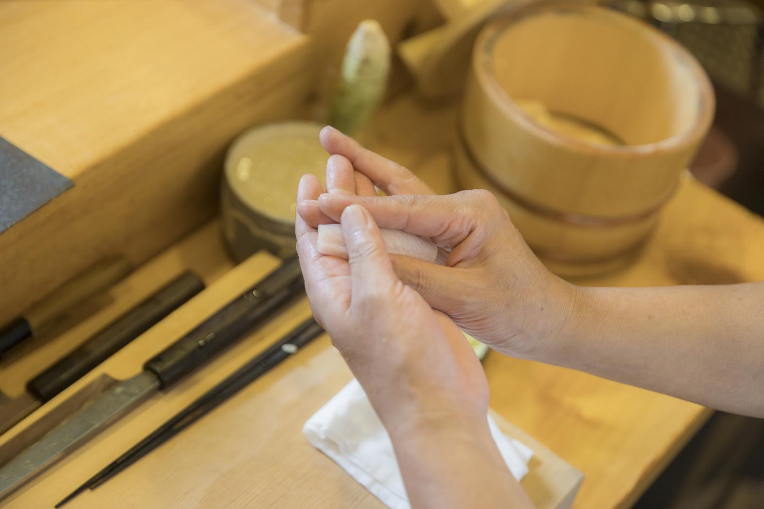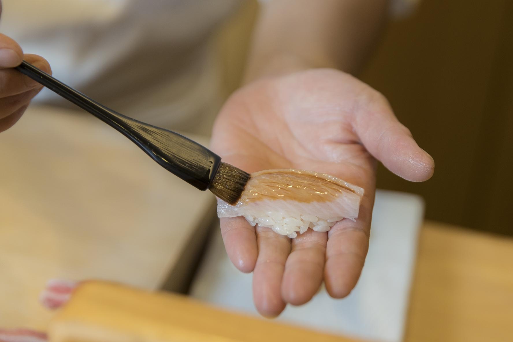 握りを出すときは、お店で仕込んだ煮切り醤油を塗ります。すぐに口に運べる状態で提供するのが、大門さんの流儀でもあります。シャリは魚津産のコシヒカリを一年間寝かせたものを使っていますが、魚を熟成させるのと同じように炊き方や酢の配合は試行錯誤を重ね続け、さらなる美味しさを目指しています。お店はヒノキの一枚板のカウンターと小上がり一室だけ。弟子は持たず、仕込みから握りまで大門さんが一人で行います。提供はコースのみ。事前予約が必要です。