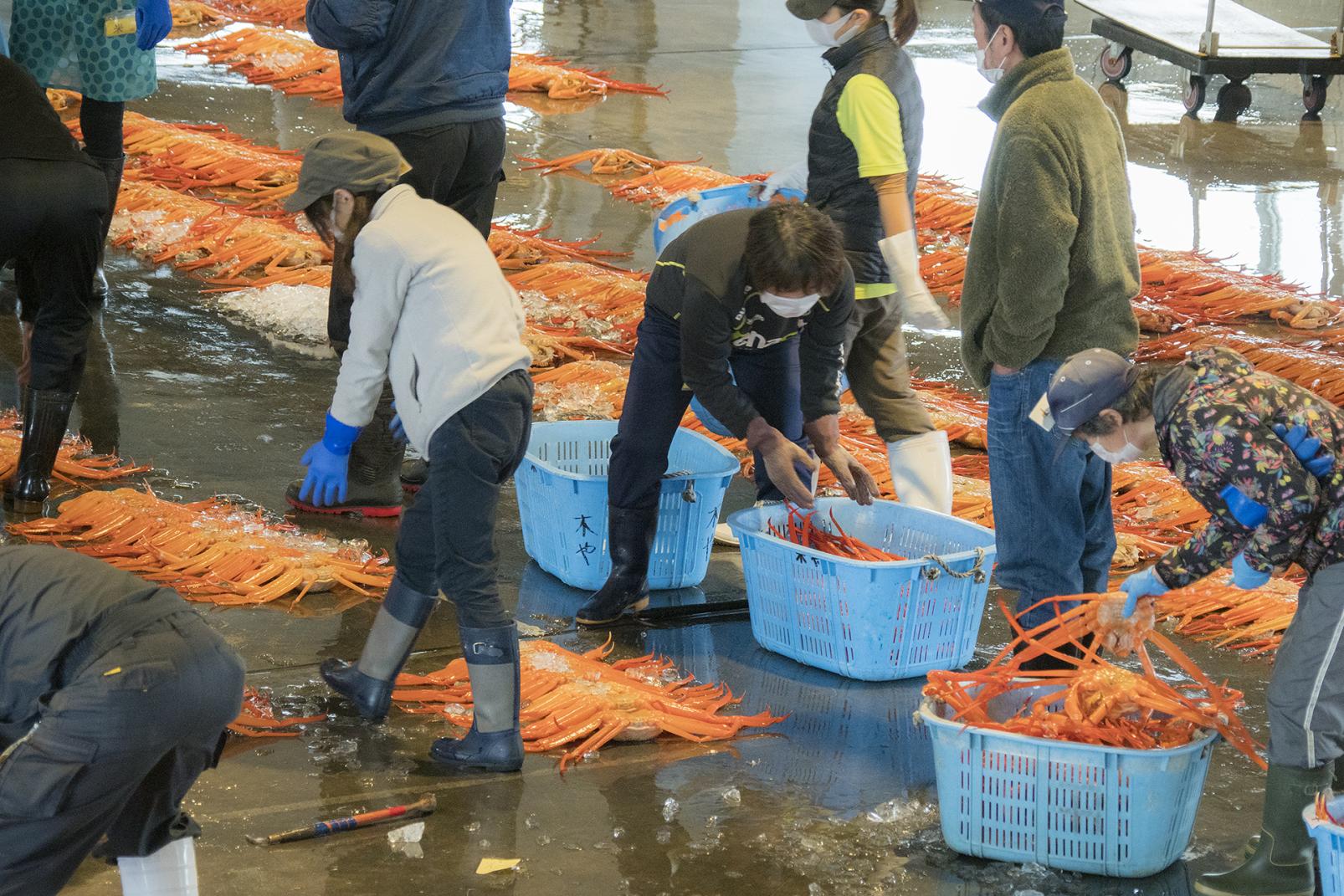 一度に20杯の紅ズワイガニが競りにかかるそうで、買参権を持つ人は自分が買いたい紅ズワイガニが競りにかかると手と声をあげて競り落とします。