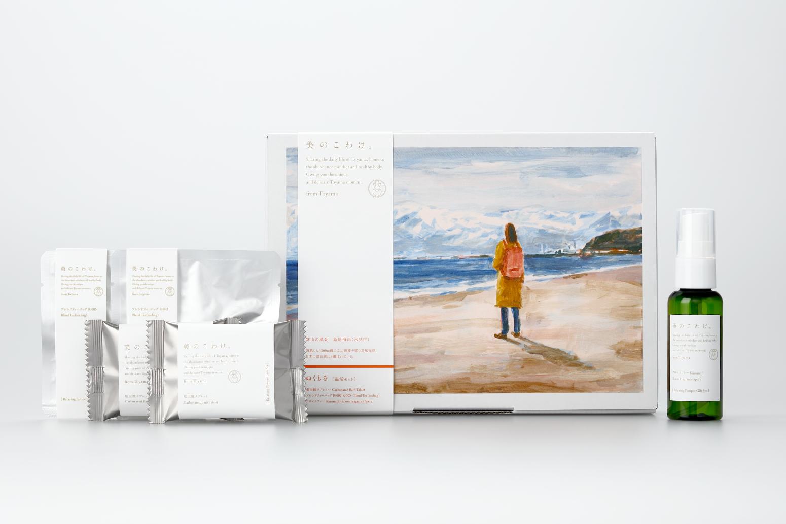 富山の日常にあふれる美と癒しのコンテンツを、あなたの日々にお届けしたい―そんな想いからうまれたのが、新しいお土産ブランド「美のこわけ」。水と大地が育む豊かな恵みを取り入れ、県内で一つひとつ丁寧に作られるクリーンビューティアイテムから、とっておきをセレクト。中でも「ぬくもる」温活セットは、富山湾海洋深層水由来の塩炭酸タブレットや、立山町のハーブを使ったブレンドティーバッグ、上市町の天然クロモジ由来のアロマスプレーが入っていておすすめ。ほっこり身体を温めて、旅の後のくつろぎタイムや毎日の癒し時間にリフレッシュしてみて。 富山旅をイメージさせる美しいパッケージも印象的なこのシリーズは、有磯海SA、道の駅雨晴、イオンモール高岡内「T.OCUL」、富山駅前マルート1階「MARX」のほか、公式オンラインショップでもゲットできる。