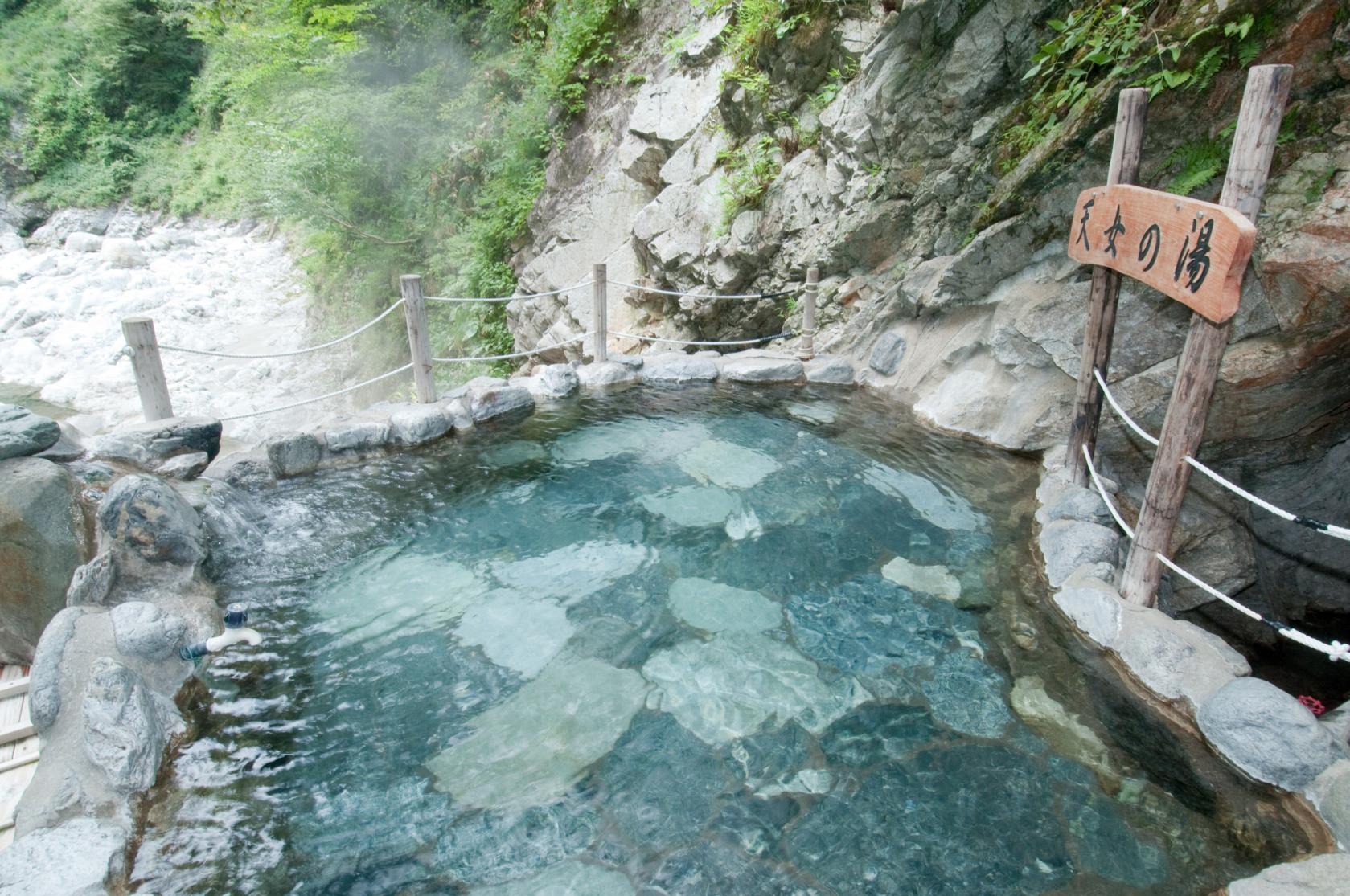 トロッコ電車の黒薙駅を下車。ここが宇奈月温泉の源泉。まさに秘湯と呼ぶにふさわしい場所にある。例年5月上旬から11 月下旬までの営業(予定)で、宿泊のほか日帰り利用にも対応。黒薙川を見下ろせる女性露天風呂「天女の湯」のほか男女別内風呂、河原に隣接した広さ28 畳相当の混浴大露天風呂もある。