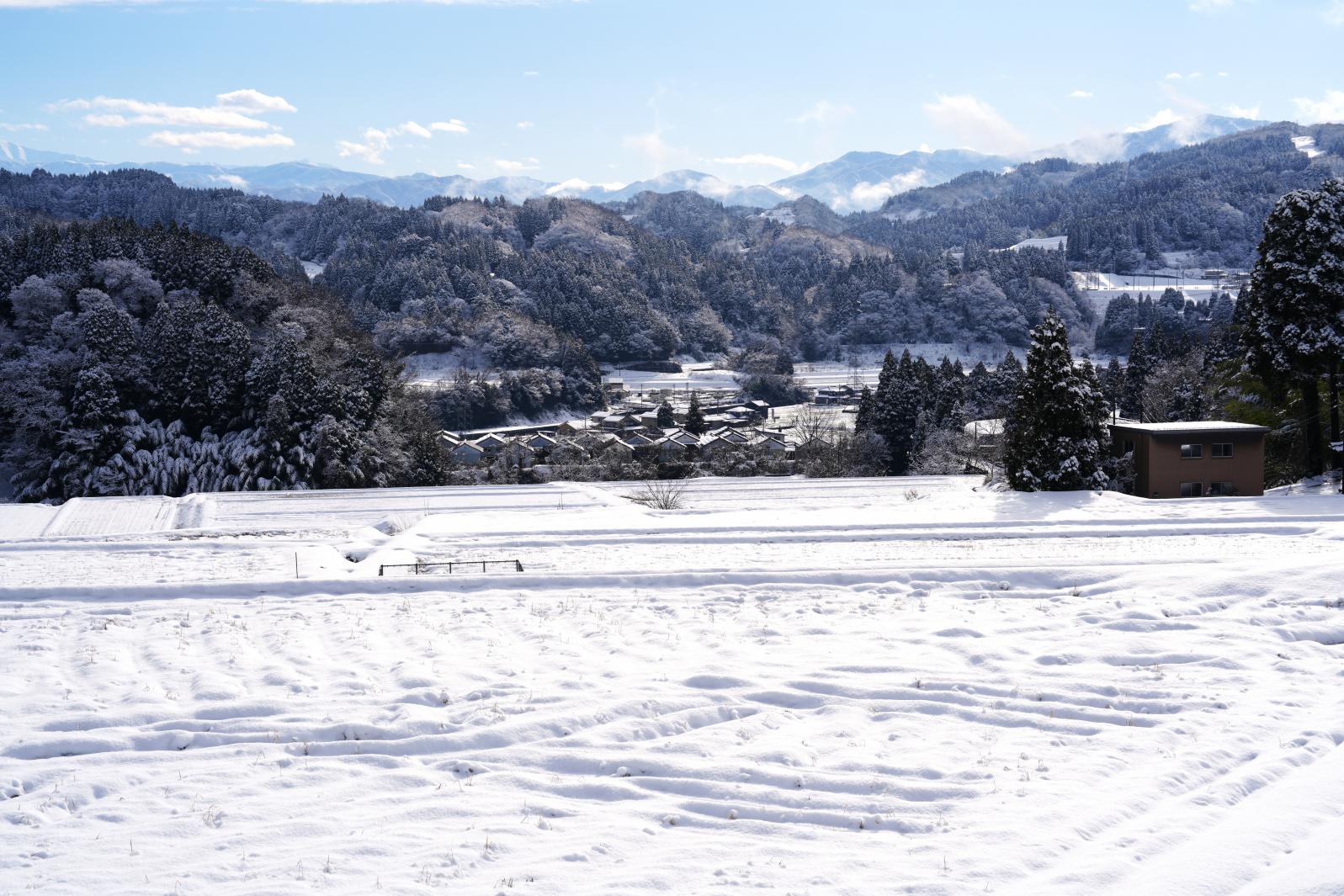 足跡ひとつない新雪がふんわりと積もった大地。そこに、動物たちが駆け回ったような足跡が点々と残る。こんな景色を見たことがありますか?その中で遊んだことはありますか?山田地区では、12月から2月にかけて、雪がしんしんと降り積もります。雪の日も多いですが、晴れた日には、その分だけ美しい景色が広がります。この日は、ちょうど晴れ渡り、絶好のコンディションでした。