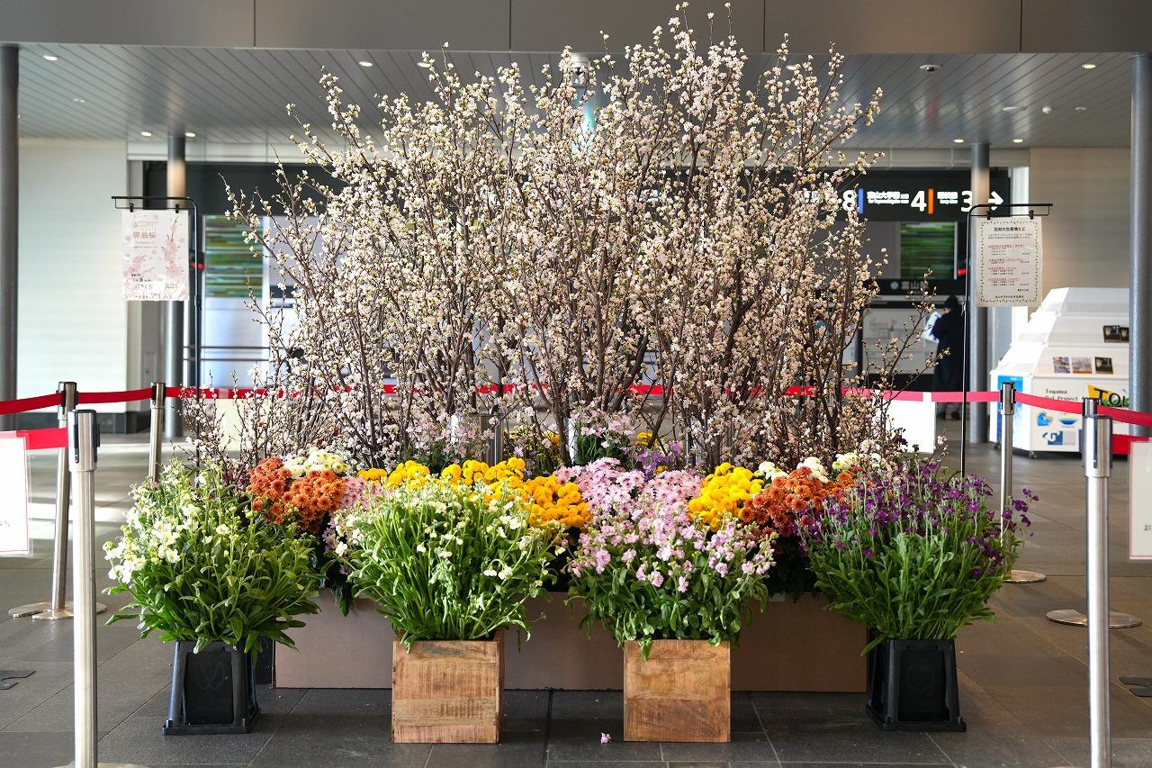 富山駅には、毎年、一足早く春の訪れを感じてもらおうと山田地区特産の啓翁桜などが飾られます。淡いピンク色の花が可憐で、切り花や贈答品として、とても人気があります。