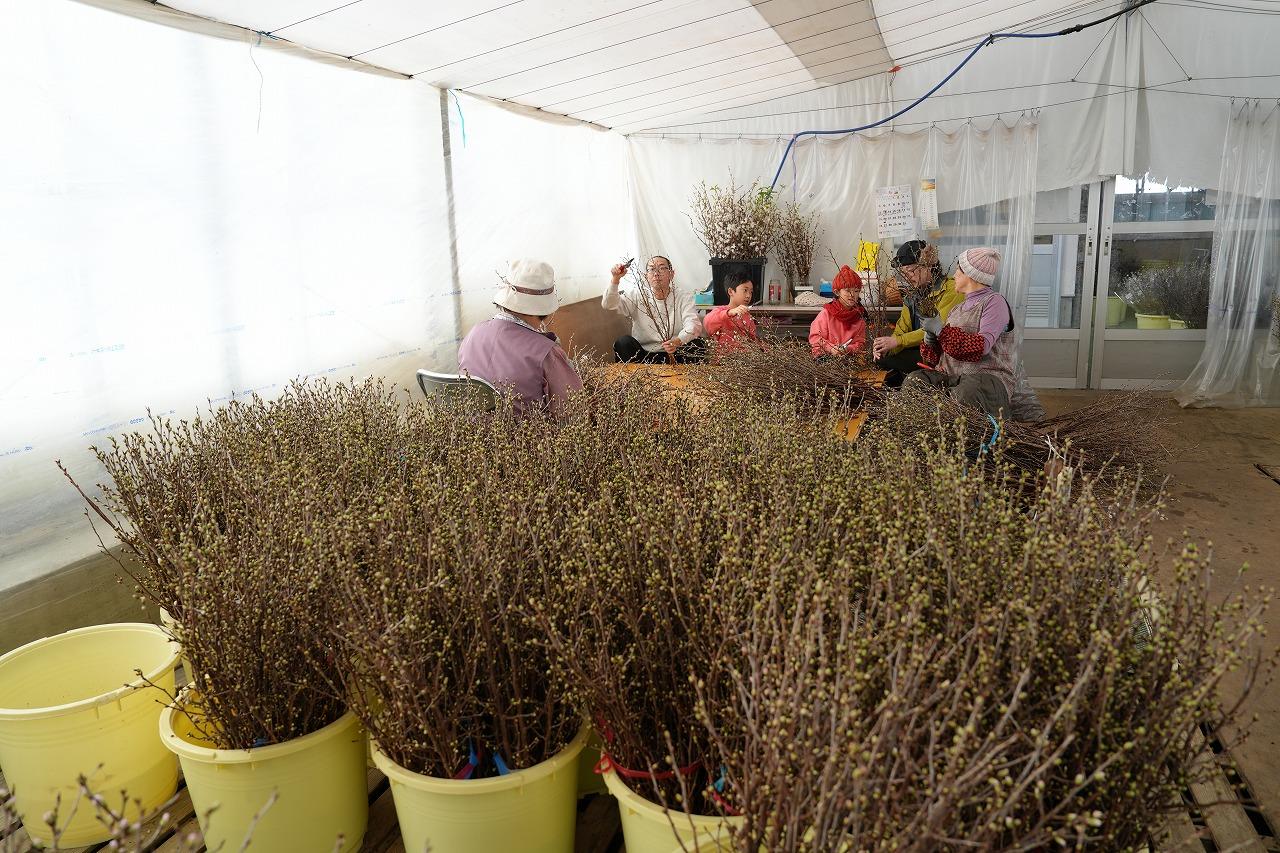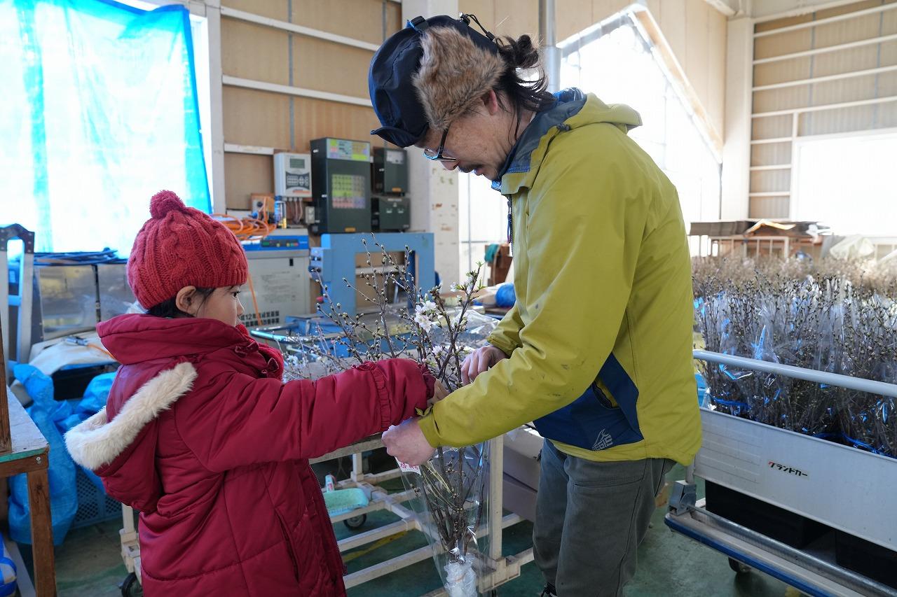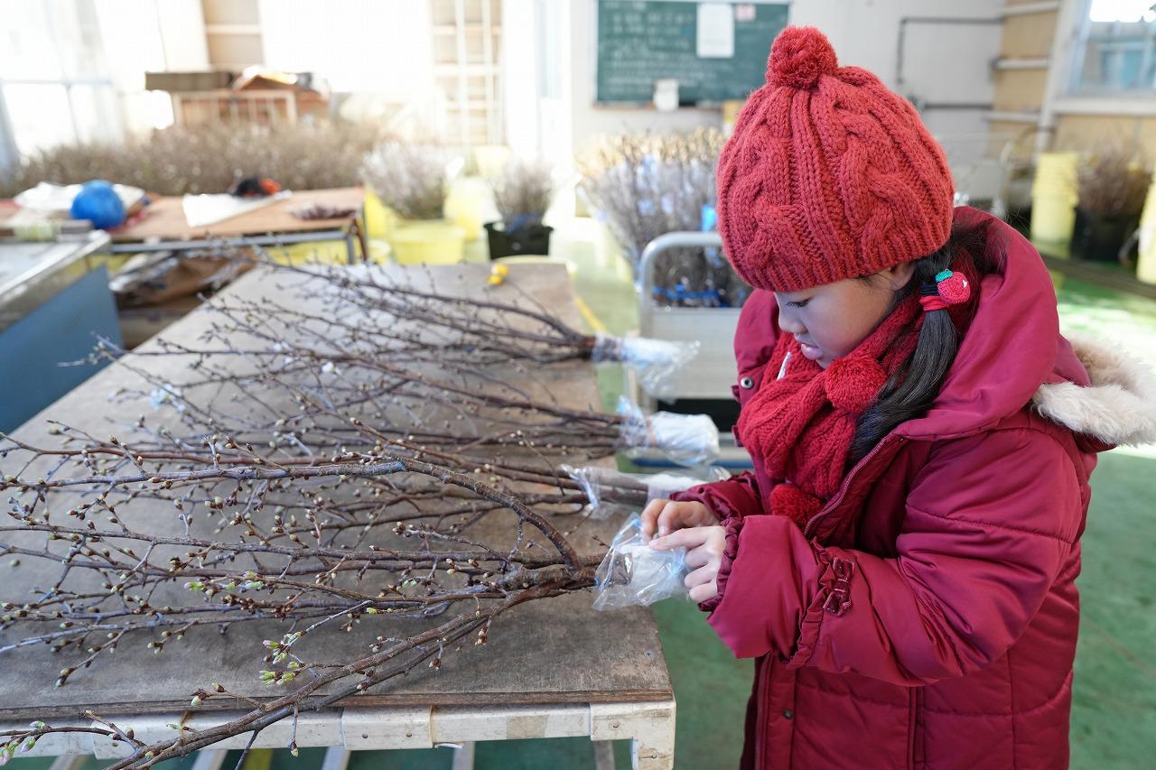 また、開花には温度管理が必要なため12月に切り出された桜は温室で丁寧に管理されていました。その後、出荷作業が行われ、各地へ届けられます。今回は、出荷作業を体験しました。