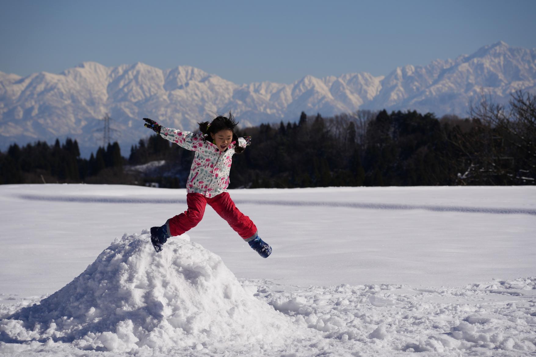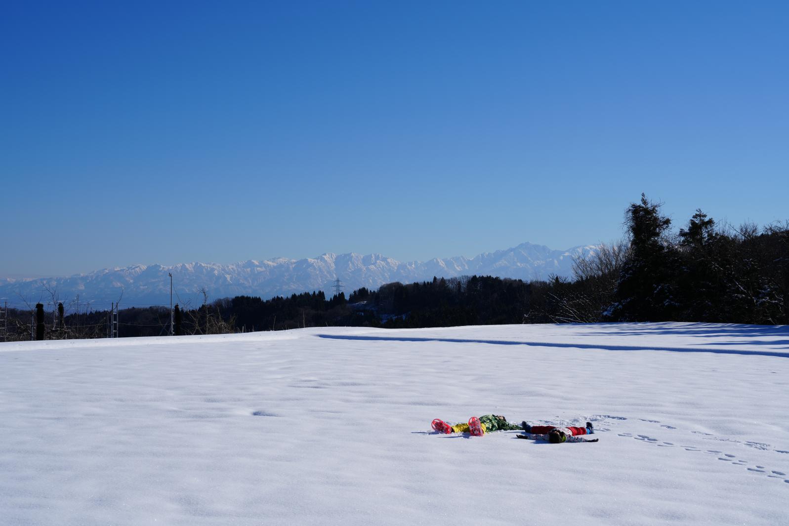雪に覆われた田んぼ一面で思いっきり遊びました。立山連峰を背景にした絶景が広がり、澄んだ空気と果てしなく続く青空がとても印象的でした。「山田地区って本当に素敵なところだな」と改めて実感しました。子供たちは「もっと遊びたい!また来れる?」と何度も口にし、時間があれば一日中遊び続けるのではないかと思うほど楽しんでいました。