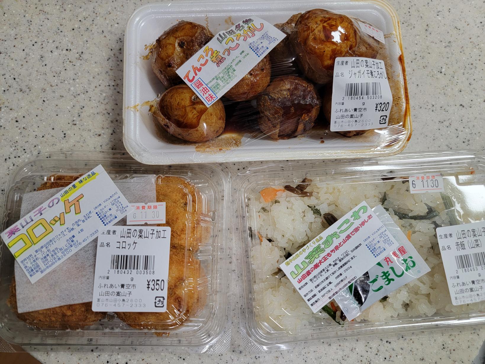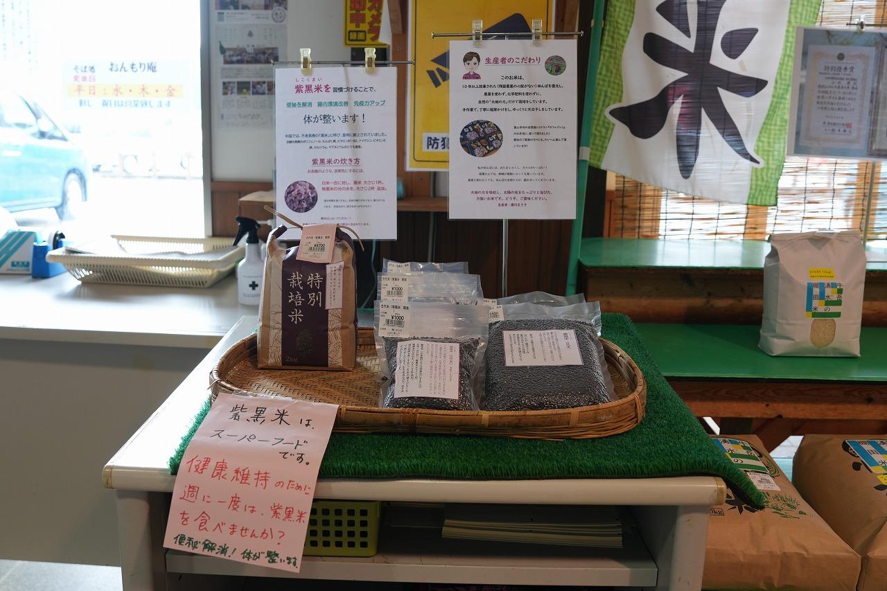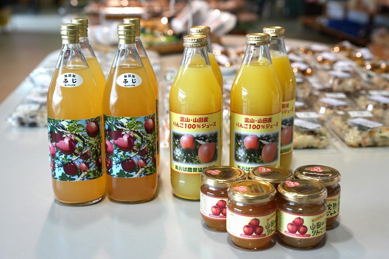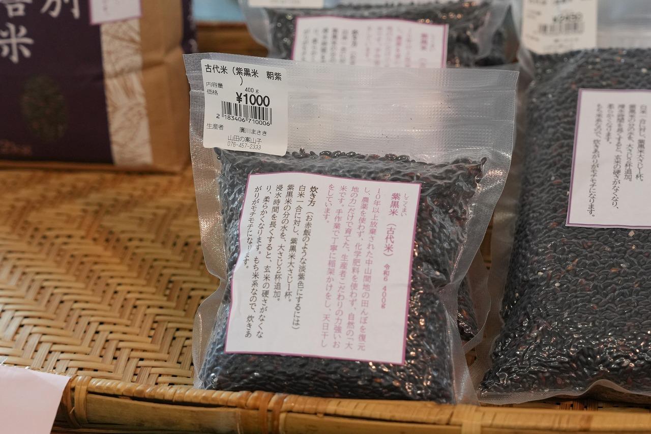 山田地区には、魅力的な特産品がたくさんあります。「ふじた農園」のりんごやジュース、ジャム、「かあかのらぽ」の純粋蜂蜜、「えごま」や「えごま油」、そして自然の「大地の力」だけで育てた「紫黒米(しこくまい)」など、どれもおすすめの逸品です。山菜やお惣菜と一緒にぜひ手に取ってみてください。