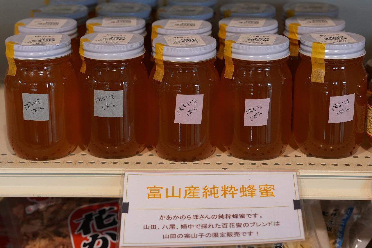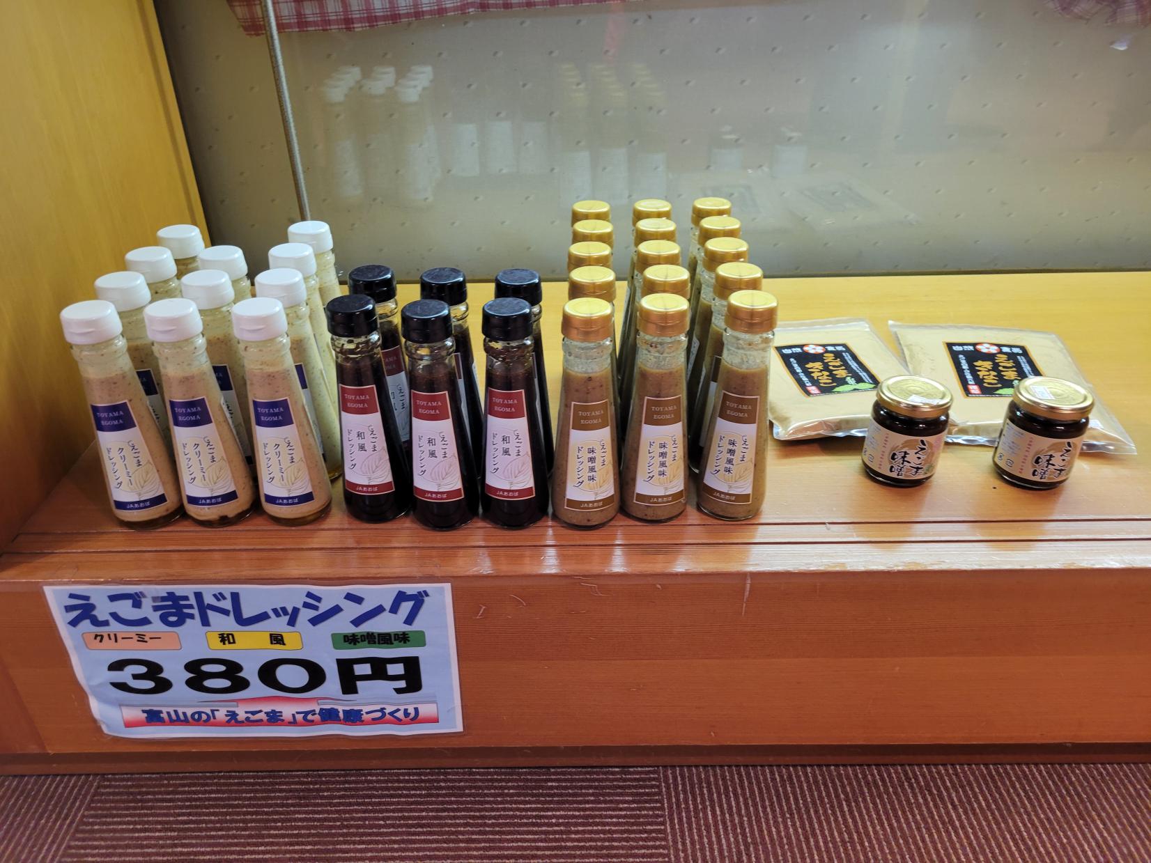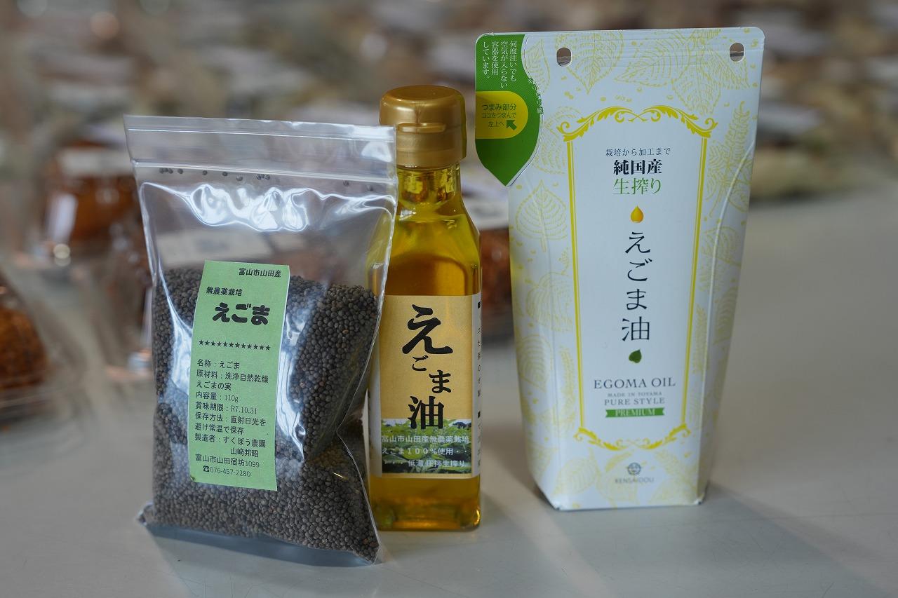 山田地区には、魅力的な特産品がたくさんあります。「ふじた農園」のりんごやジュース、ジャム、「かあかのらぽ」の純粋蜂蜜、「えごま」や「えごま油」、そして自然の「大地の力」だけで育てた「紫黒米(しこくまい)」など、どれもおすすめの逸品です。山菜やお惣菜と一緒にぜひ手に取ってみてください。