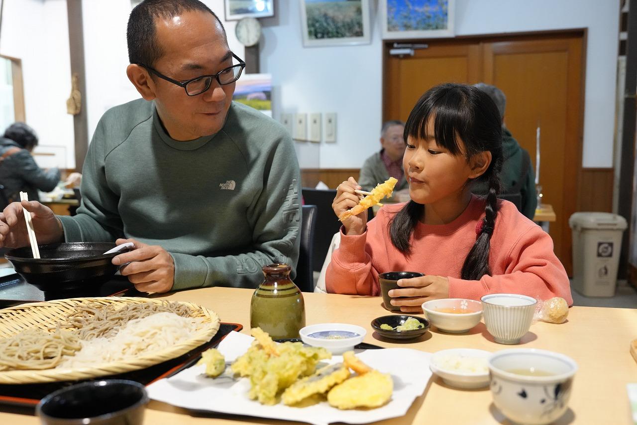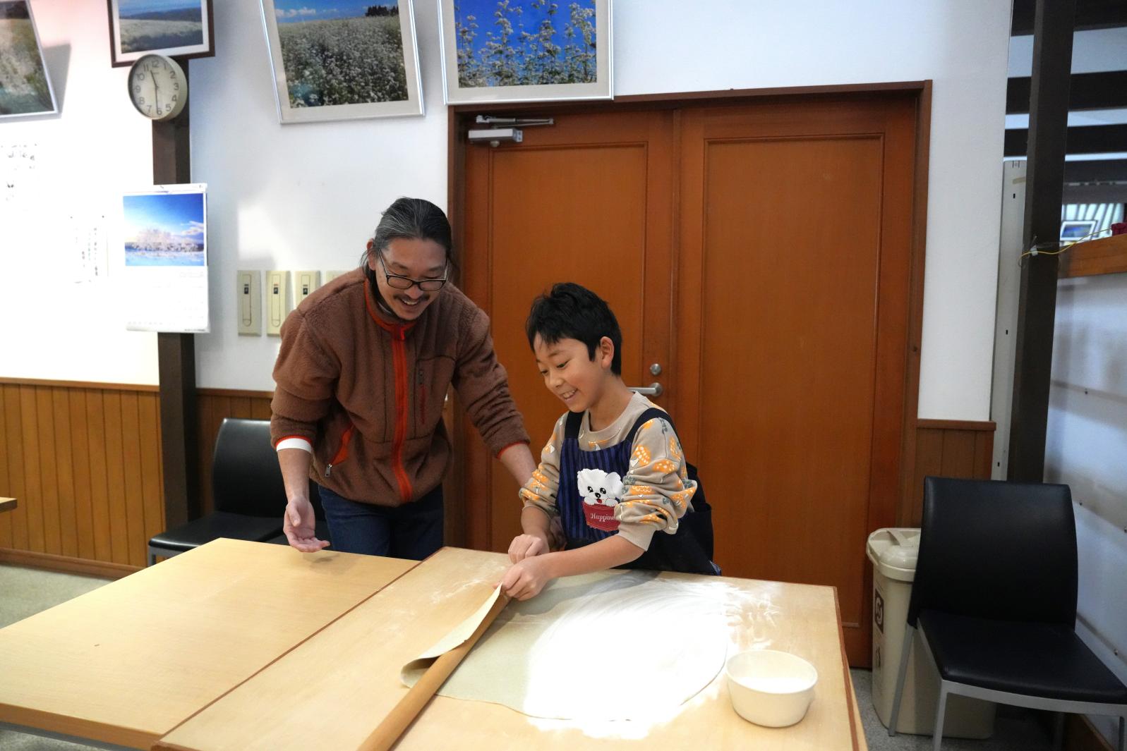 まずは先生が丁寧に見本を見せてくださいました。その後、親子(父と娘)と息子(一人で挑戦)がそば打ちに挑戦。初めての体験でしたが、難しいところは随時教えてもらえるので、安心して取り組むことができました。「このそば粉が本当に食べられるそばになるの?」と最初は半信半疑だった子供たちも、工程を進めるごとに楽しさが増し、時には歓声をあげながら夢中で体験を楽しんでいました。