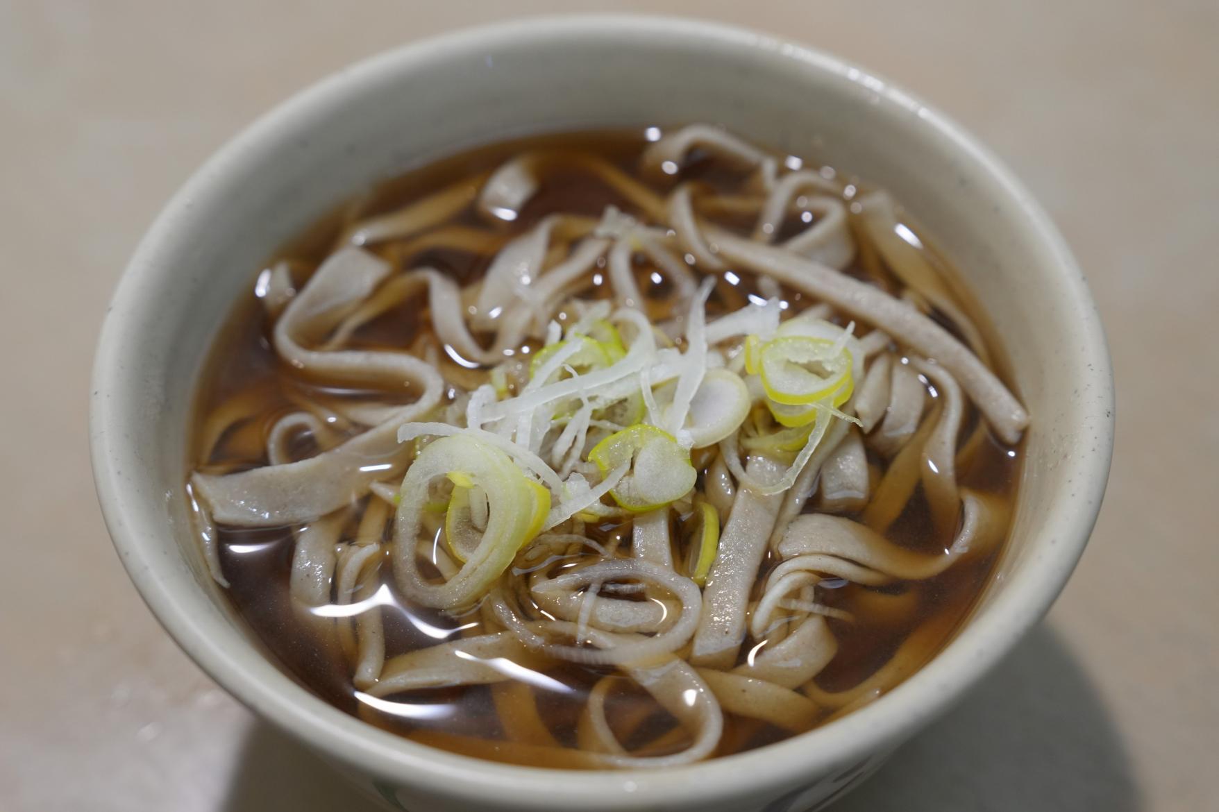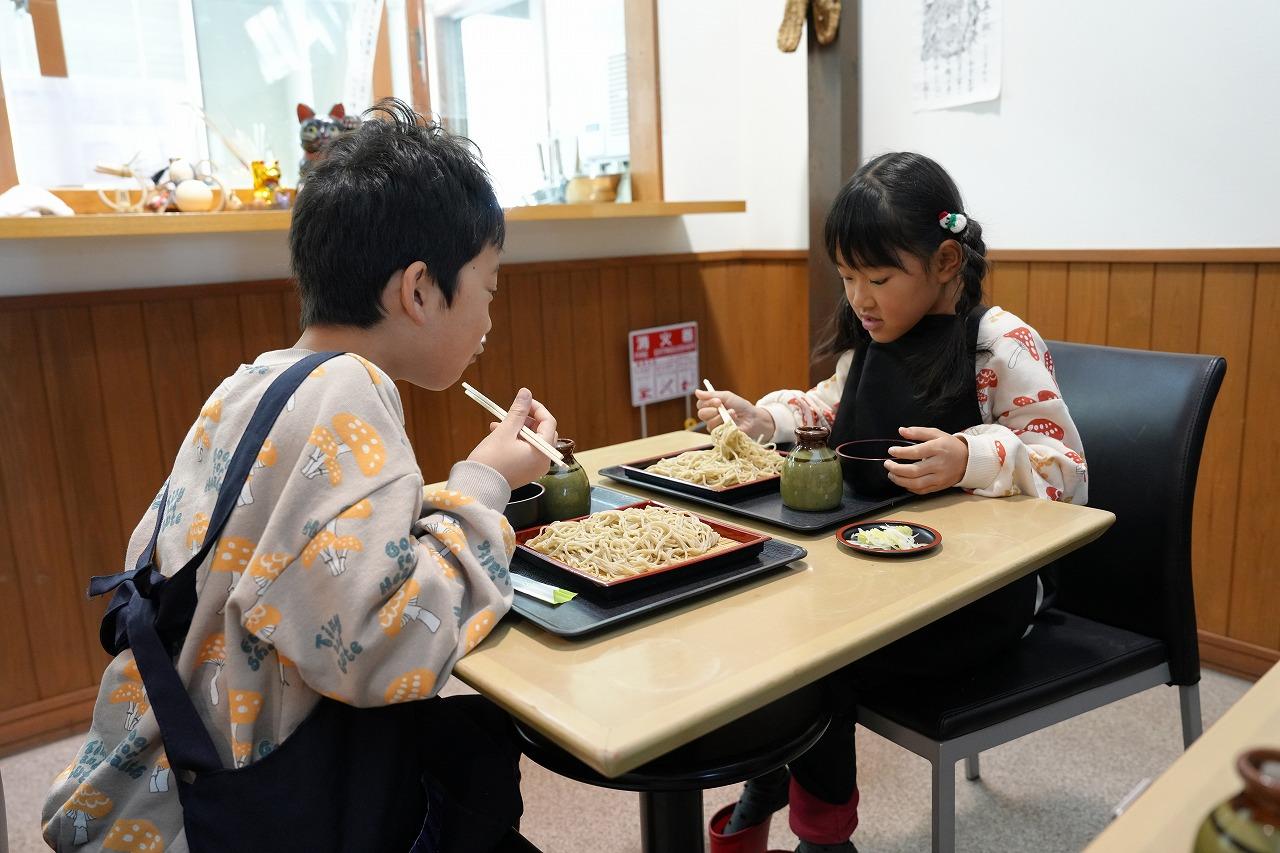 そば打ち体験では、自分たちで打ったそばをその場でいただくことができます。子供たちは「先生のそば、すごい!そばの細さが全部同じ!」と感心していました。一方、初めての挑戦で作った自分たちのそばは、太くて不揃いでしたが、「味は同じだね!歯ごたえがあって食べ応えがある!」と自画自賛していました。